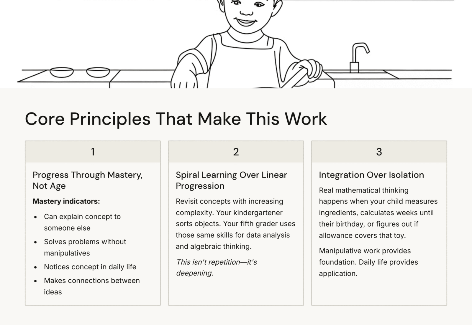 Before we dive into grade-by-grade specifics, you need to understand the three principles that hold this entire approach together.
