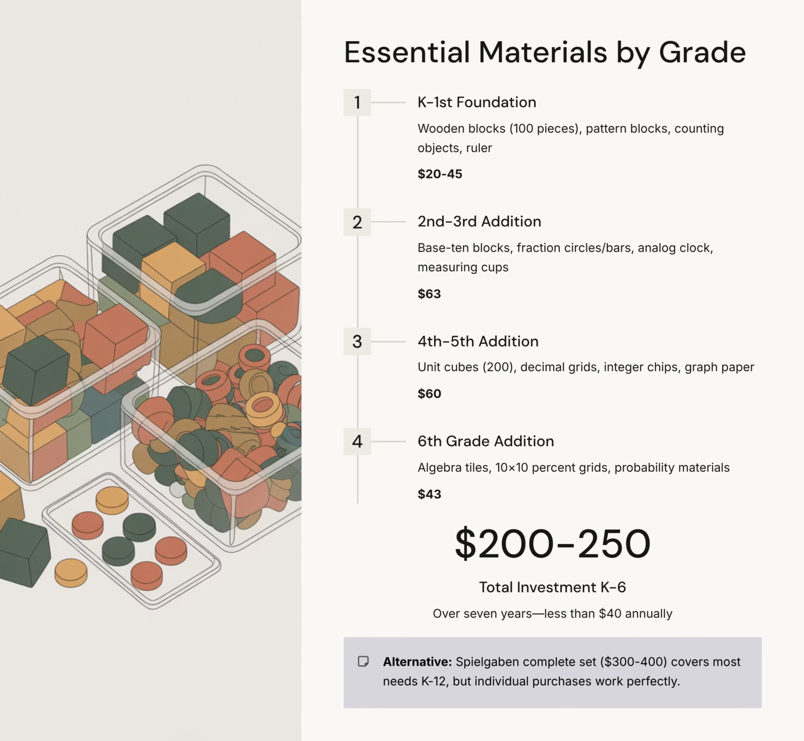 Alternative approach: Spielgaben complete set ($300-400) includes blocks, pattern materials, manipulatives, and structured activities covering most of these needs, plus extensions through high school. But you can absolutely create a complete program with individual purchases or homemade alternatives.