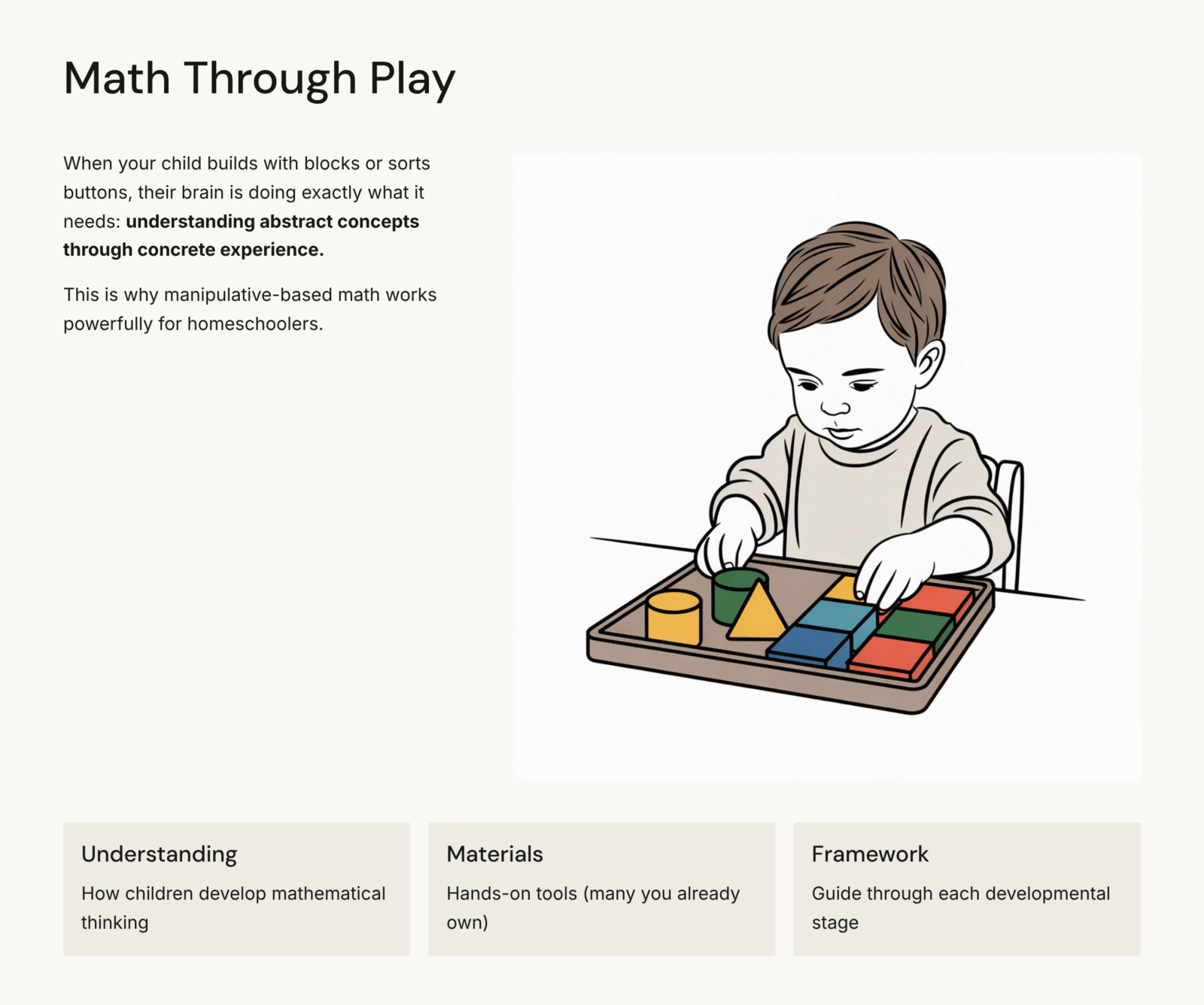What you need instead is understanding of how children develop mathematical thinking, a collection of hands-on materials (many you already own), and a framework that guides you through each developmental stage. That’s what this guide provides.