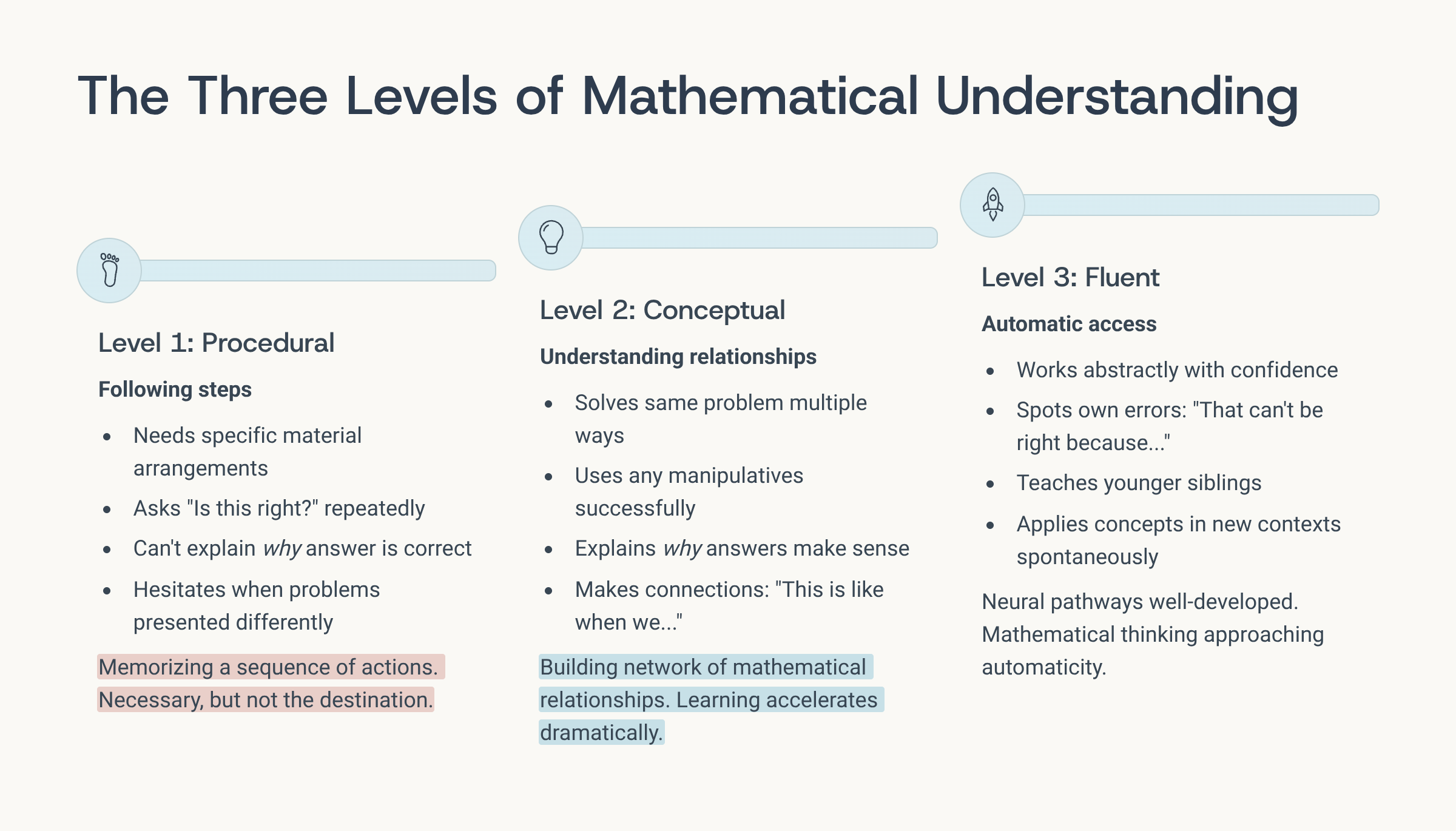 If he’s stuck on one method, he’s still at the procedural level. If he can show you two or three approaches, conceptual understanding is developing.