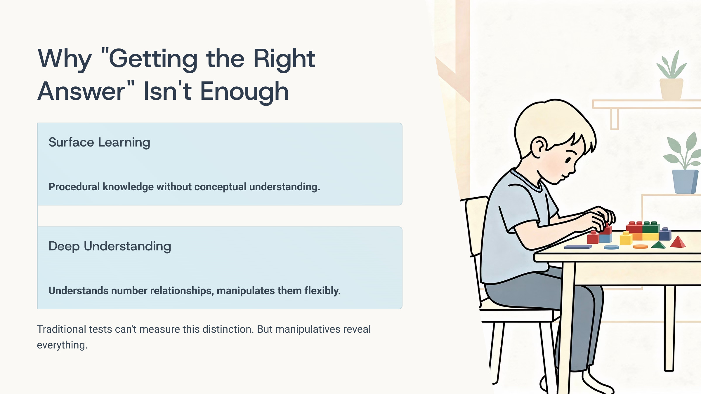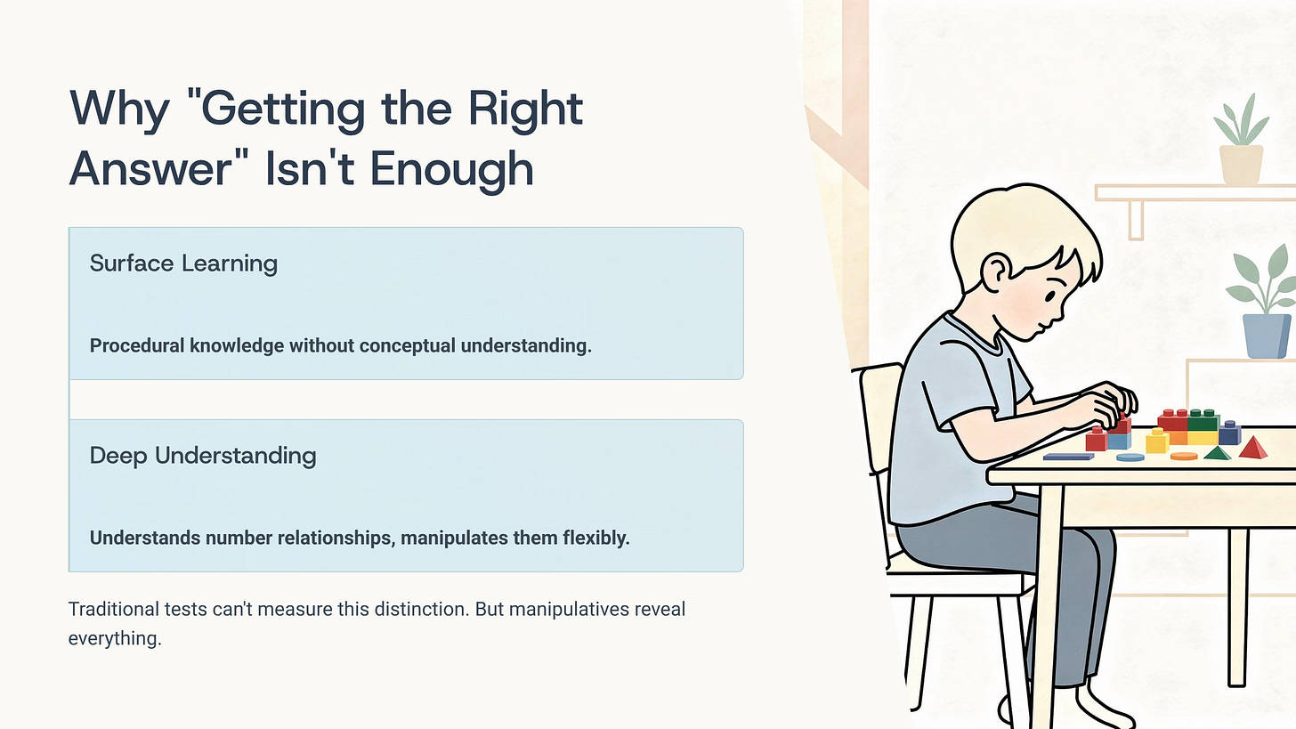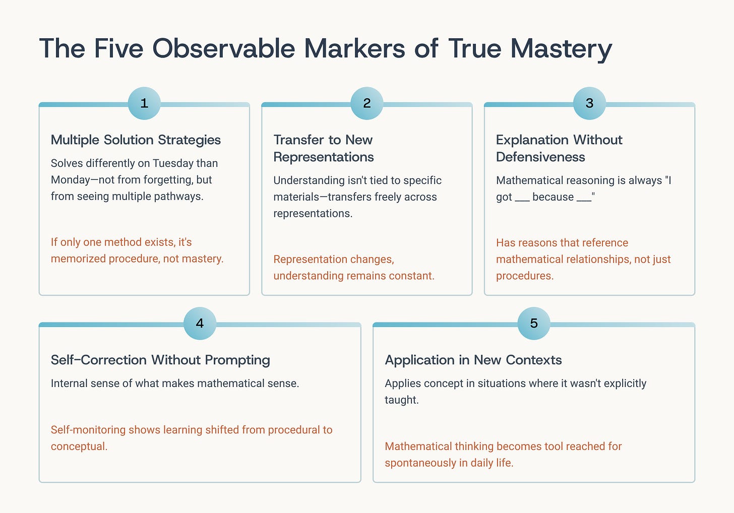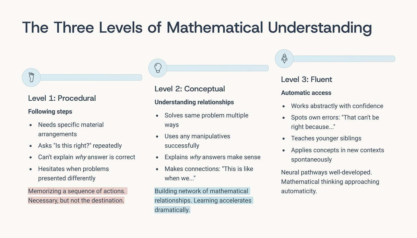 A child with genuine understanding doesn’t just have answers—she has reasons. And those reasons reference mathematical relationships, not just procedures.