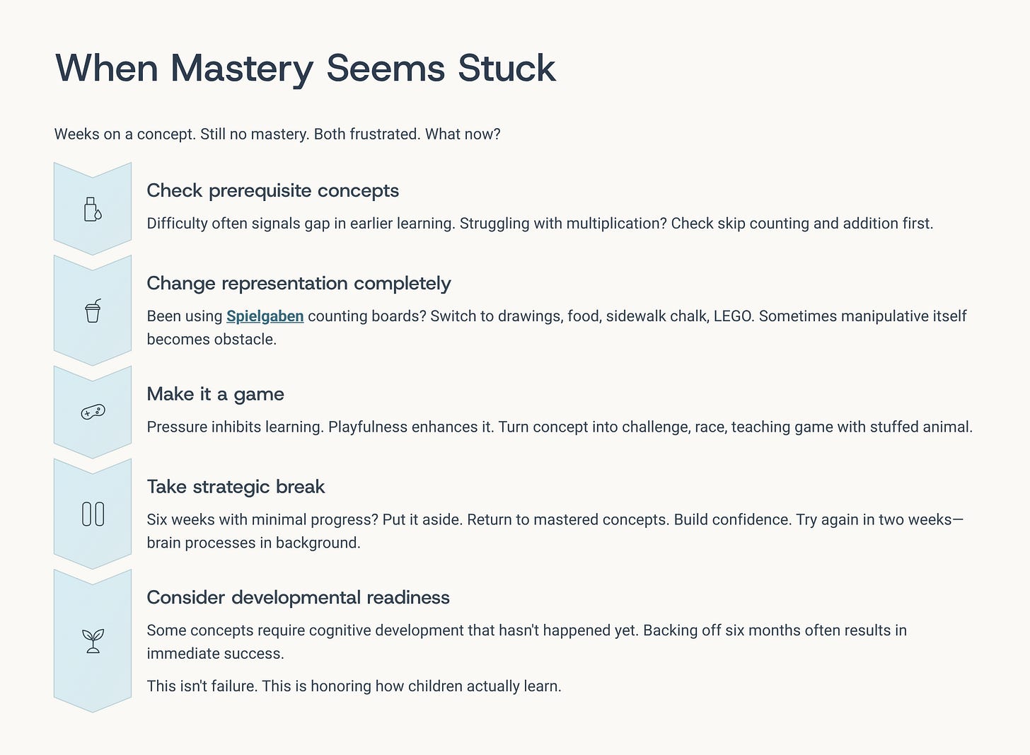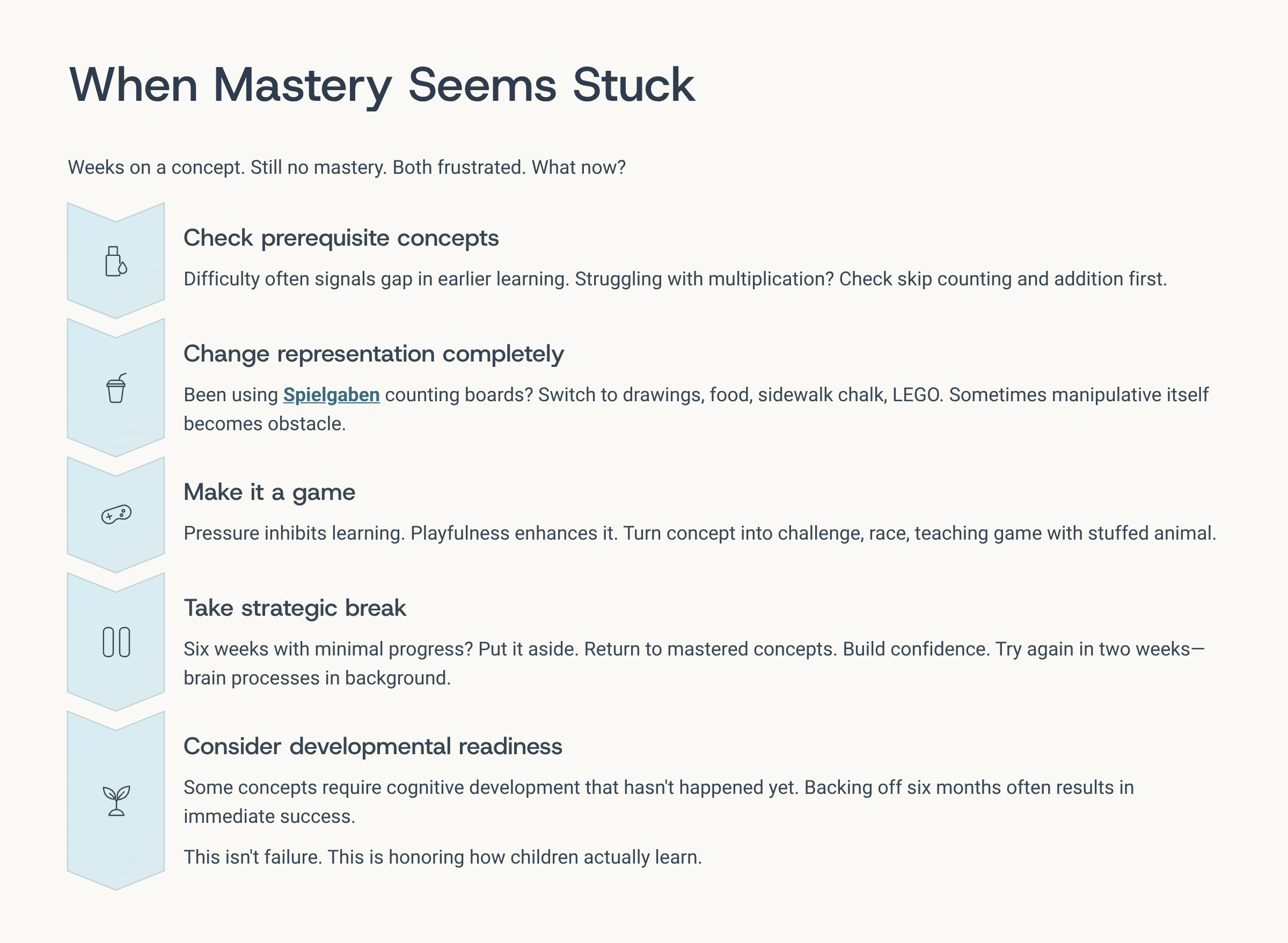 Sometimes you’ve spent weeks on a concept and your child still hasn’t reached mastery. You’re both frustrated. The manipulatives aren’t helping anymore. What now?
