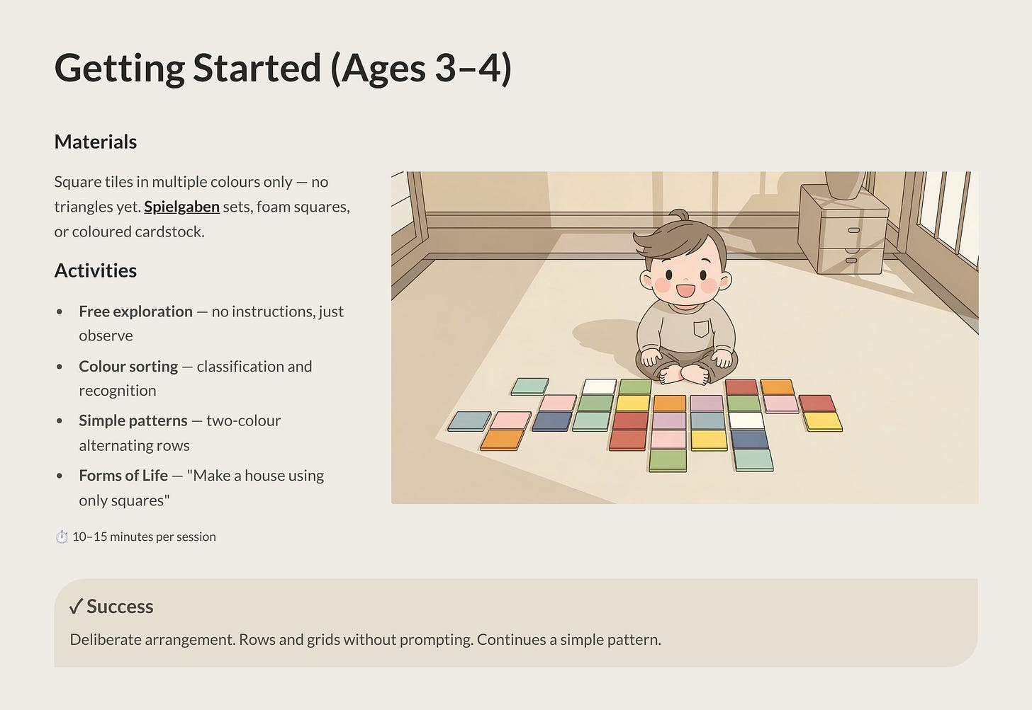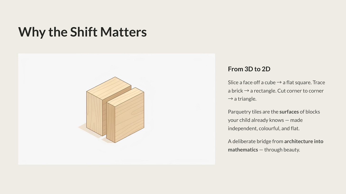 Today, we cross a threshold in our Masterclass. We’re moving from the three-dimensional building blocks of the Gifts into the world of Fröbel’s “Occupations”—hands-on creative activities that take the principles children have learned through block play and extend them into new dimensions. And our first Occupation is one of the most visually stunning and mathematically rich activities in the entire Fröbelian system: laying flat, coloured tiles to create patterns, pictures, and geometric discoveries.
