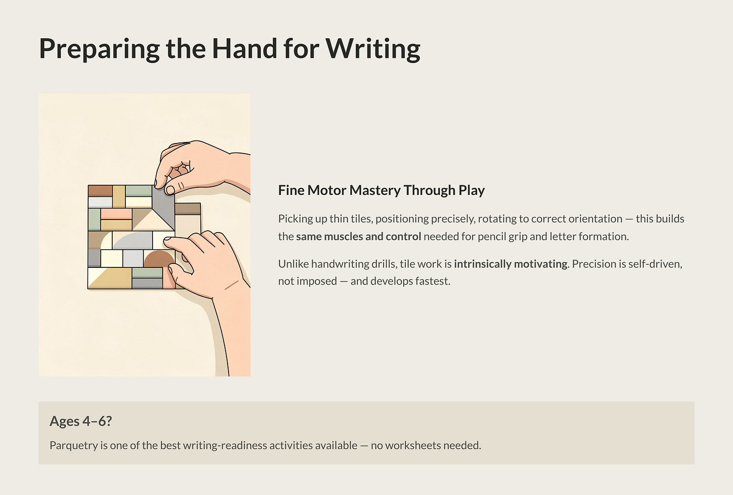 If your child is between ages 4 and 6 and you’re wondering whether they’re “ready” for writing, Parquetry is one of the best preparatory activities available. It strengthens the same muscles, develops the same control, and builds the same hand-eye coordination—all without a single worksheet.