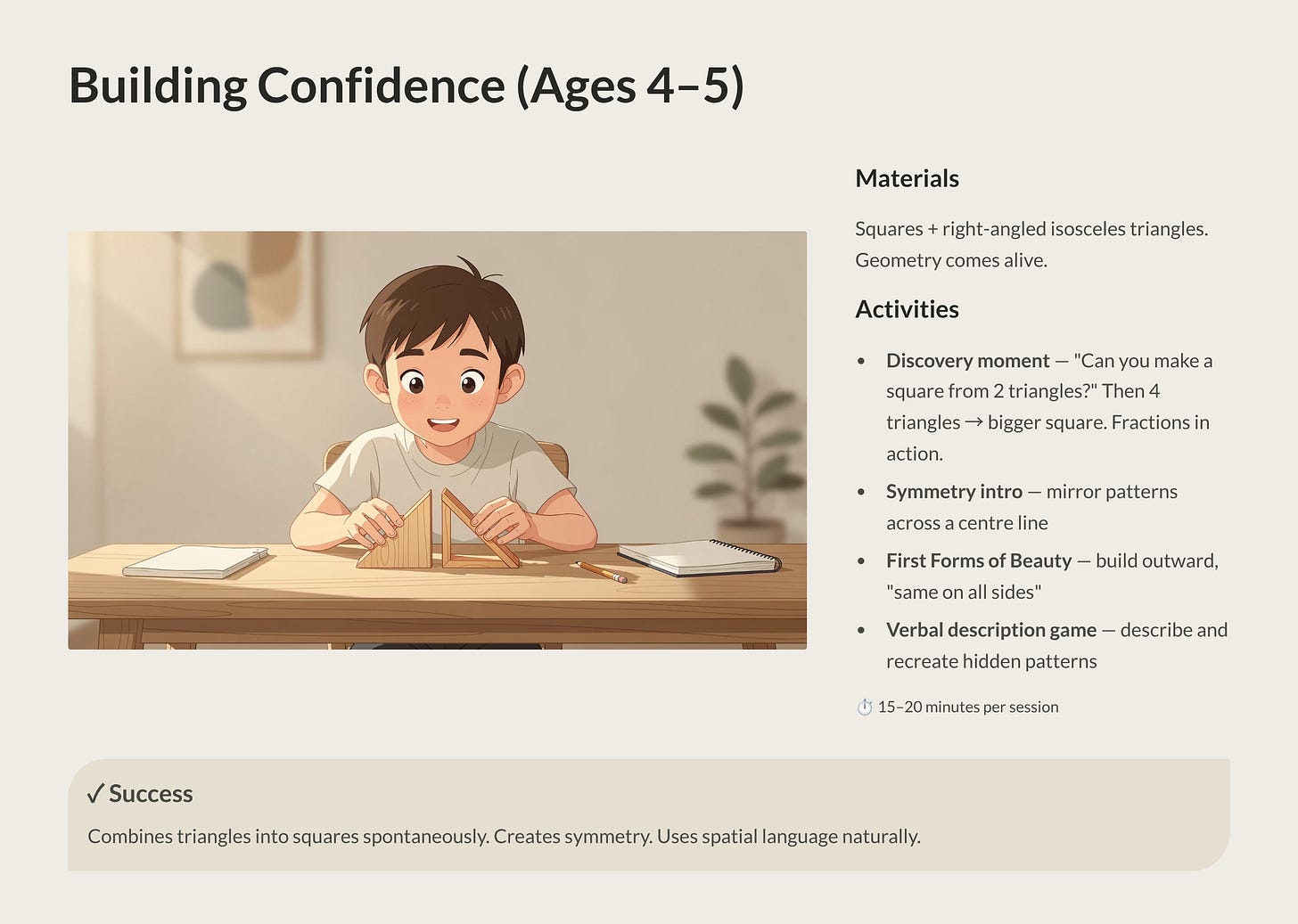 What success looks like: Your child combines triangles into squares and rectangles spontaneously. They create symmetrical patterns without being reminded. They begin using spatial language (”next to,” “above,” “diagonal”) naturally.