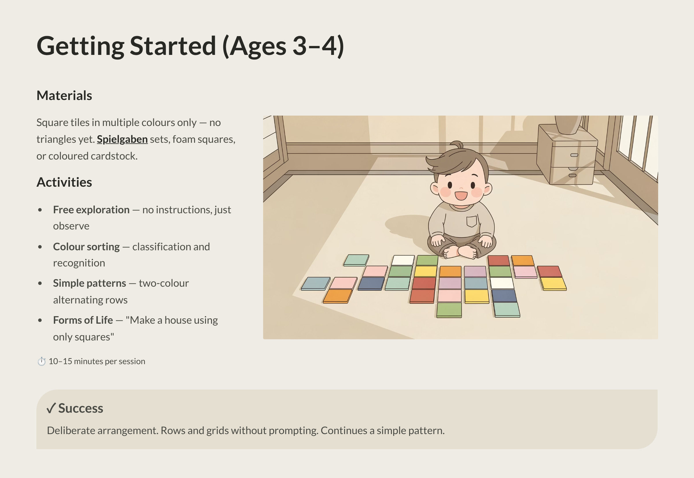 Today, we cross a threshold in our Masterclass. We’re moving from the three-dimensional building blocks of the Gifts into the world of Fröbel’s “Occupations”—hands-on creative activities that take the principles children have learned through block play and extend them into new dimensions. And our first Occupation is one of the most visually stunning and mathematically rich activities in the entire Fröbelian system: laying flat, coloured tiles to create patterns, pictures, and geometric discoveries.