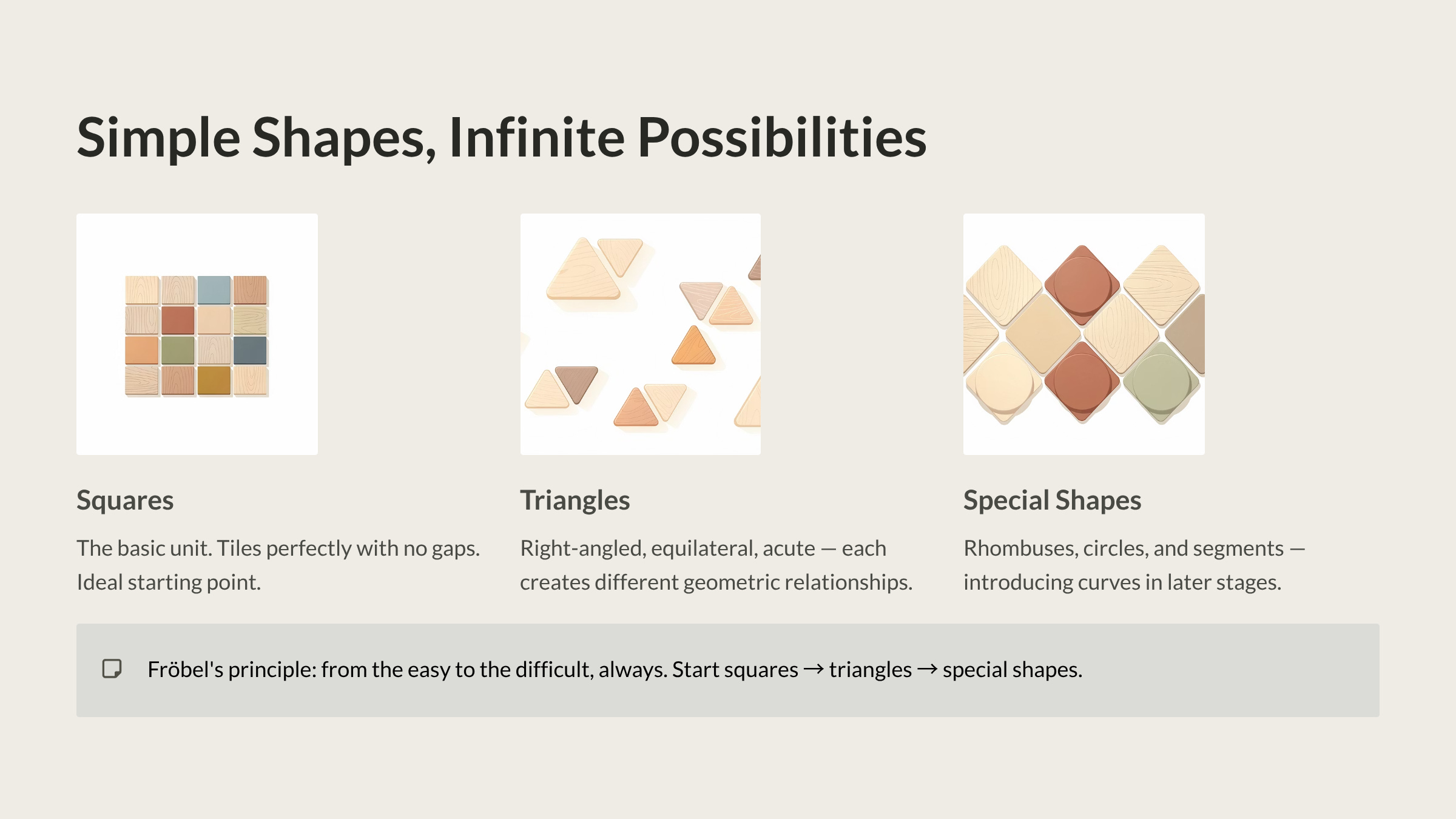 Squares — the most basic unit. These match the faces of the Gift blocks your child has already handled. They tile perfectly, leaving no gaps, which makes them an ideal starting point.