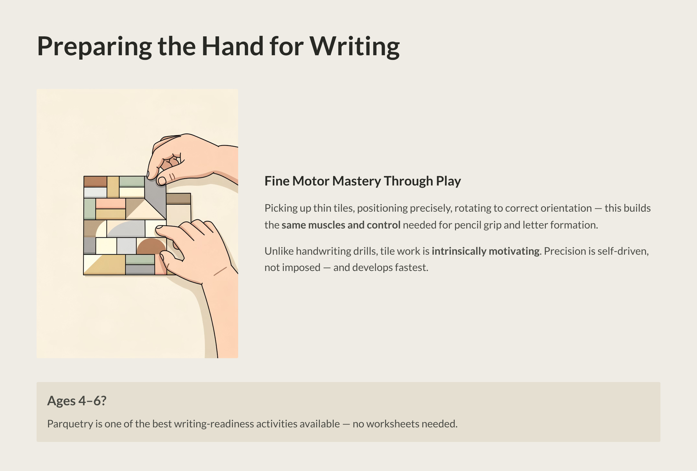 If your child is between ages 4 and 6 and you’re wondering whether they’re “ready” for writing, Parquetry is one of the best preparatory activities available. It strengthens the same muscles, develops the same control, and builds the same hand-eye coordination—all without a single worksheet.