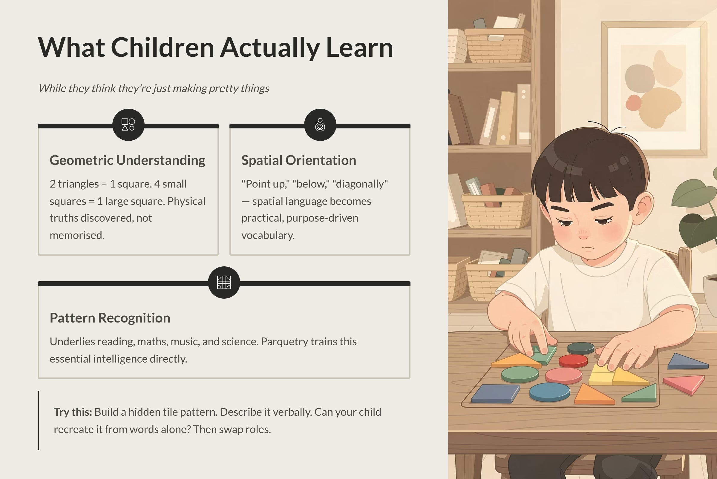 Parquetry trains this ability directly. When your child creates a repeating pattern with tiles—red square, blue triangle, red square, blue triangle—they’re practising the same cognitive skill that will later help them spot the pattern in a number sequence, recognise a rhyme scheme in poetry, or identify a trend in data.
