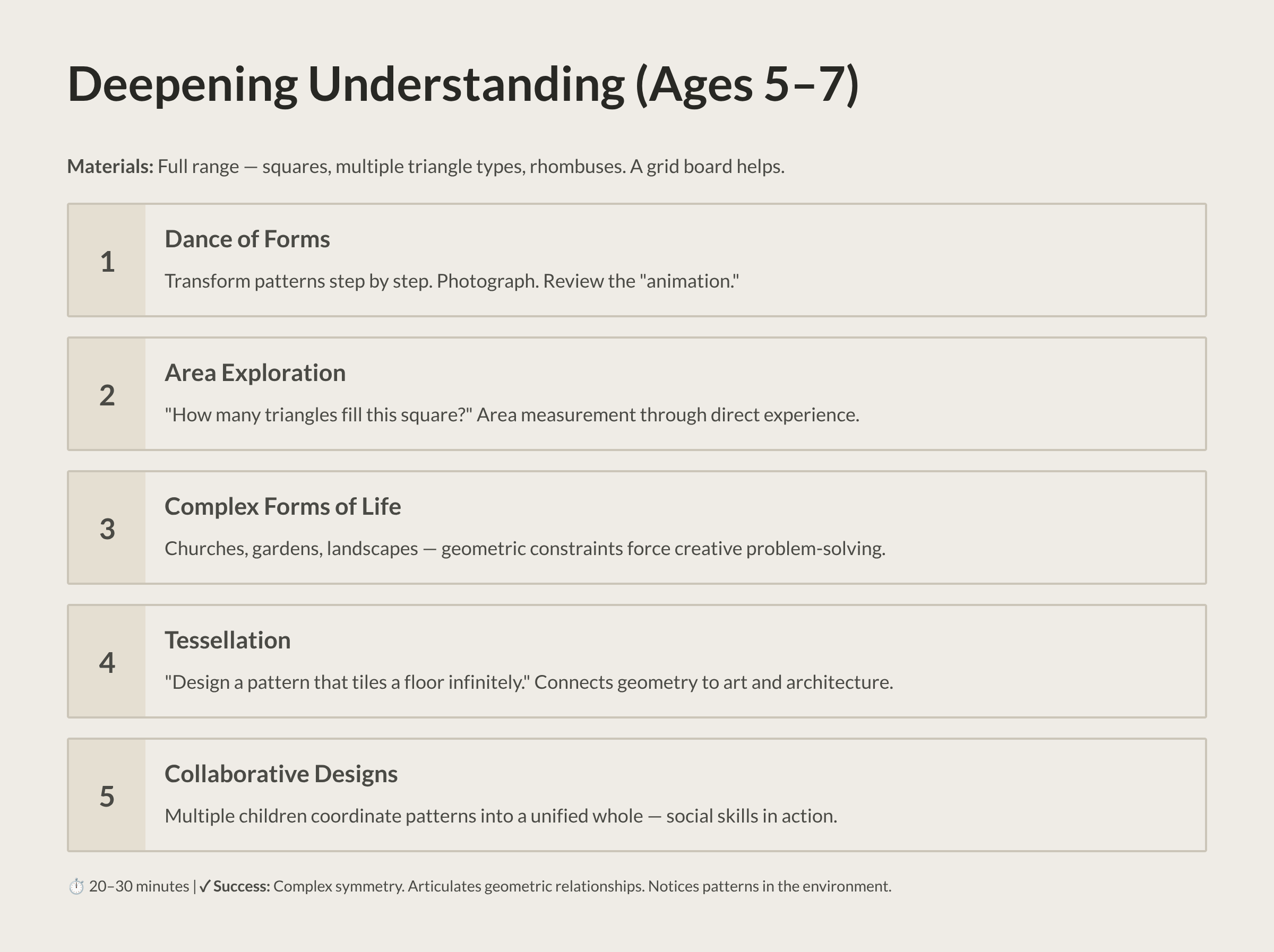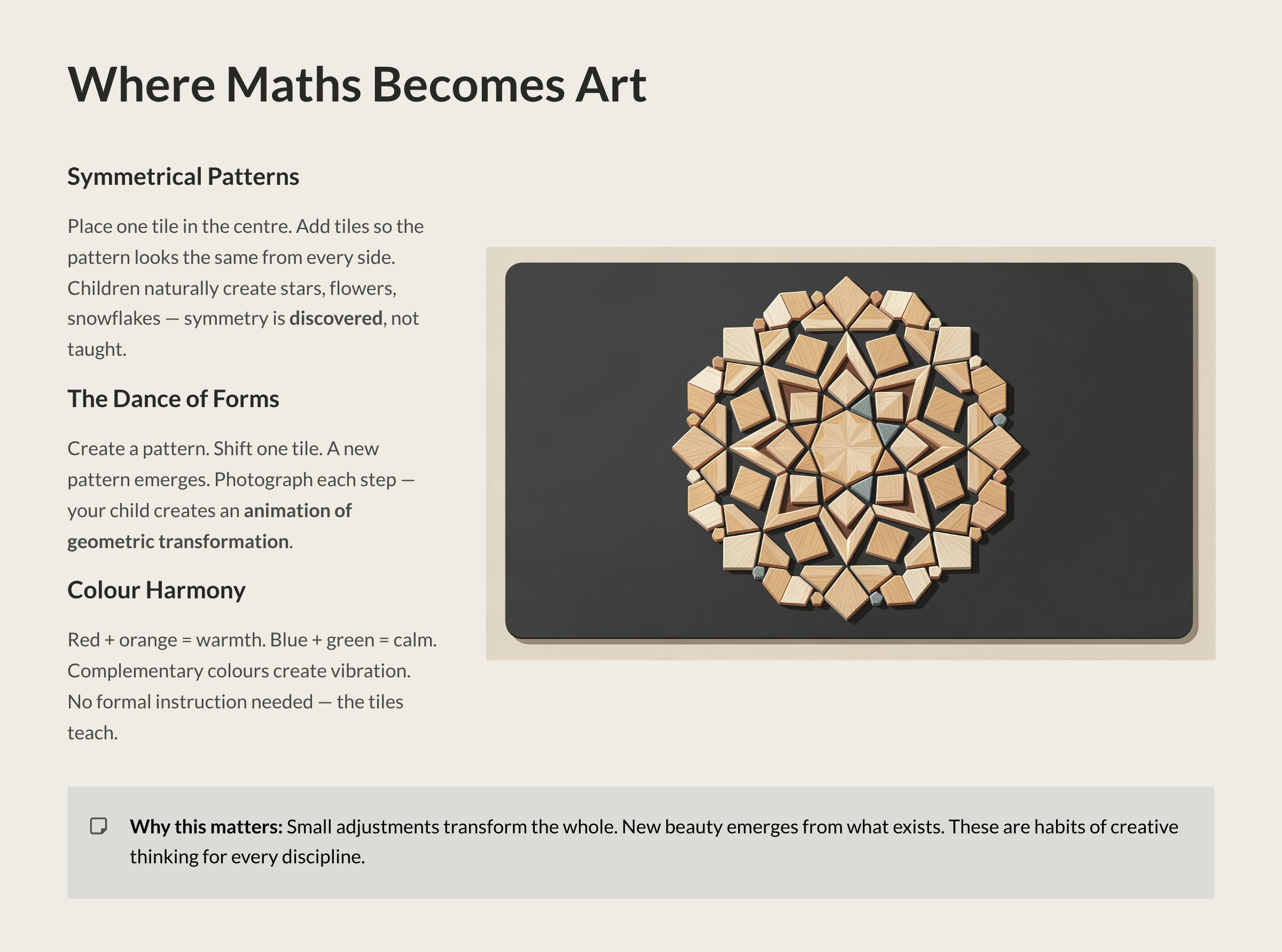 Why this matters: The Dance of Forms teaches children that change can be gradual and systematic. That a small adjustment can transform the whole. That new beauty can emerge from what already exists. These are principles that apply far beyond tile patterns—they’re habits of creative thinking that will serve your child in every discipline they encounter.