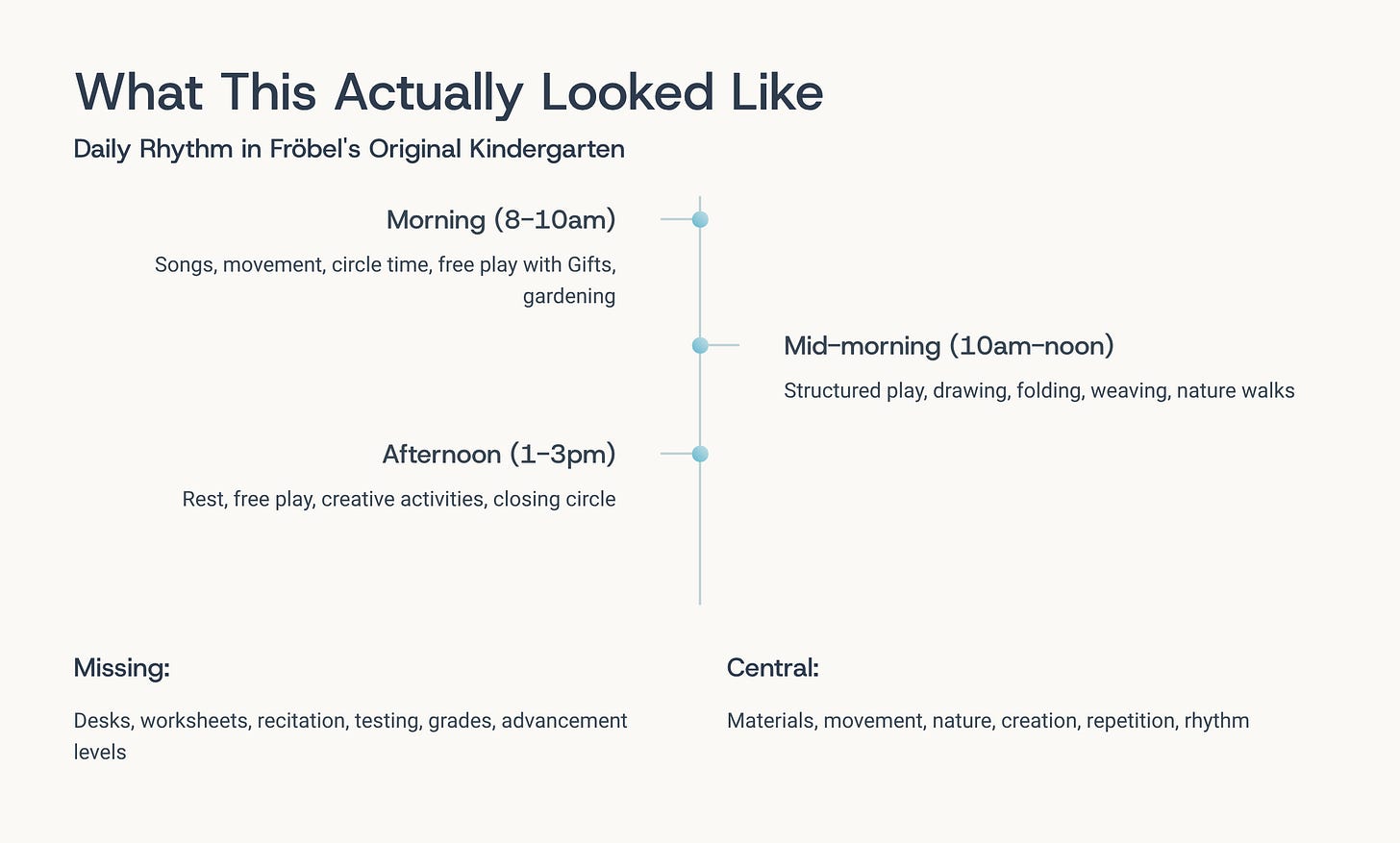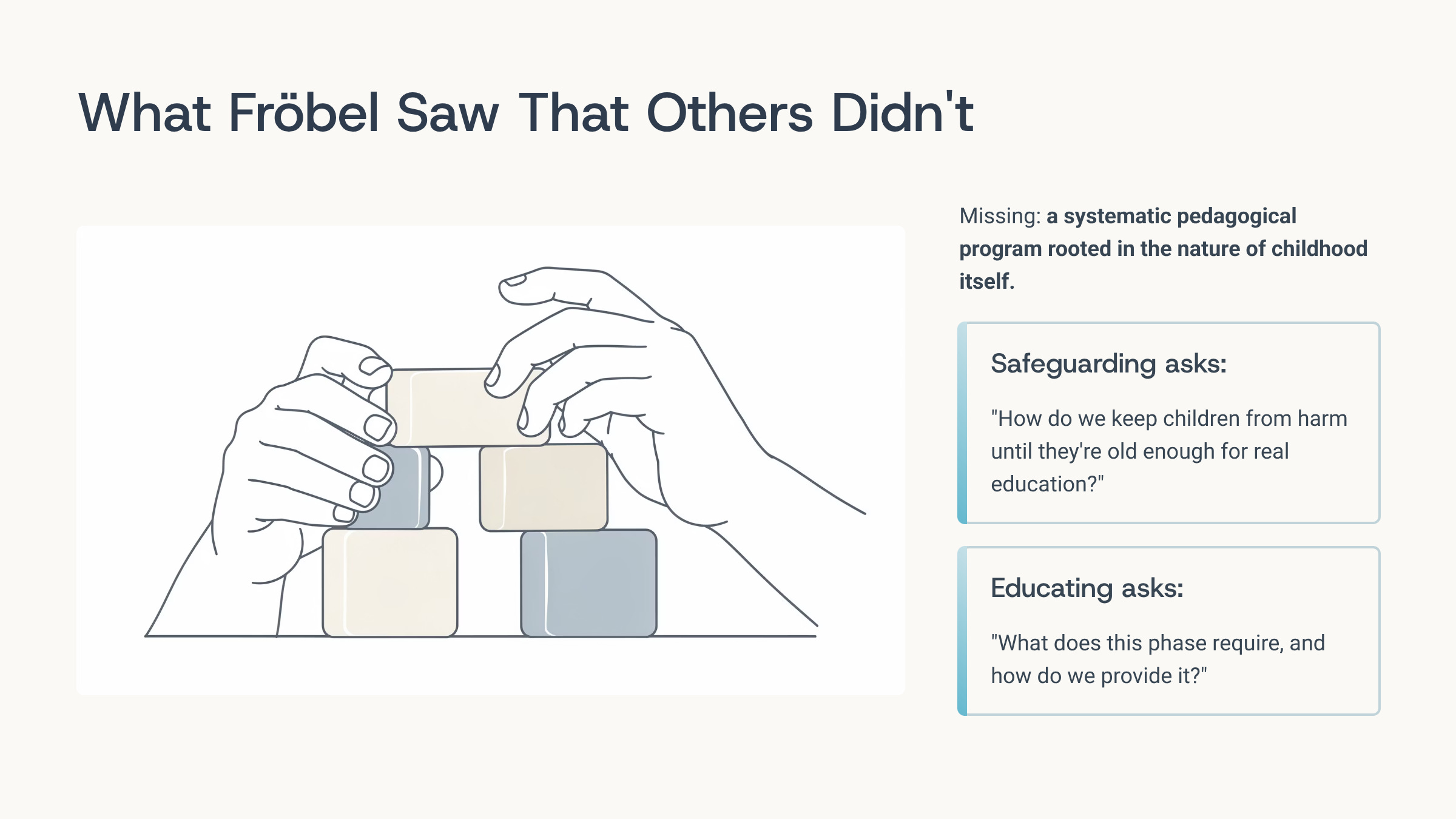 Fröbel looked at these institutions and recognized they were missing something essential: a systematic pedagogical program rooted in the nature of childhood itself.