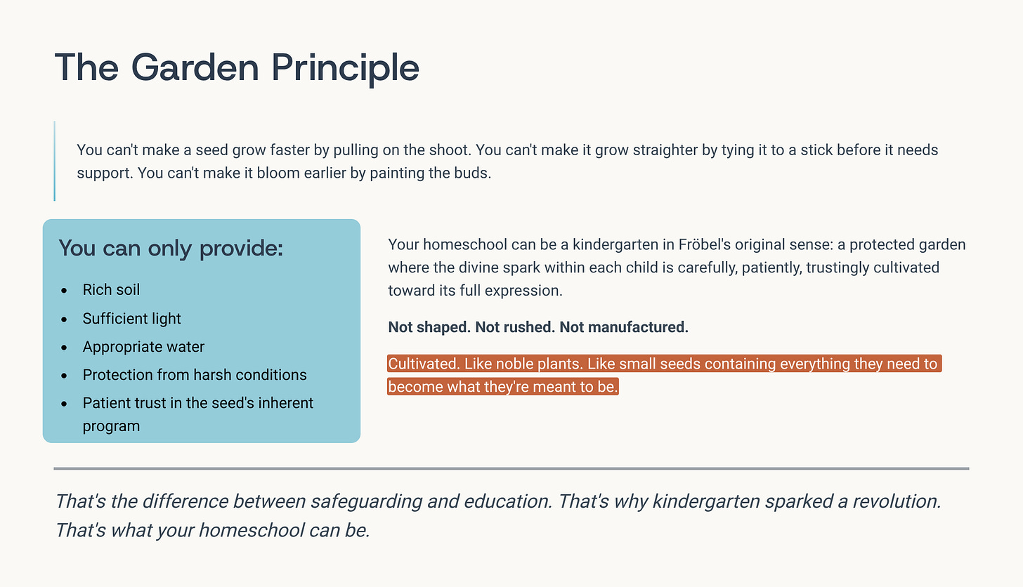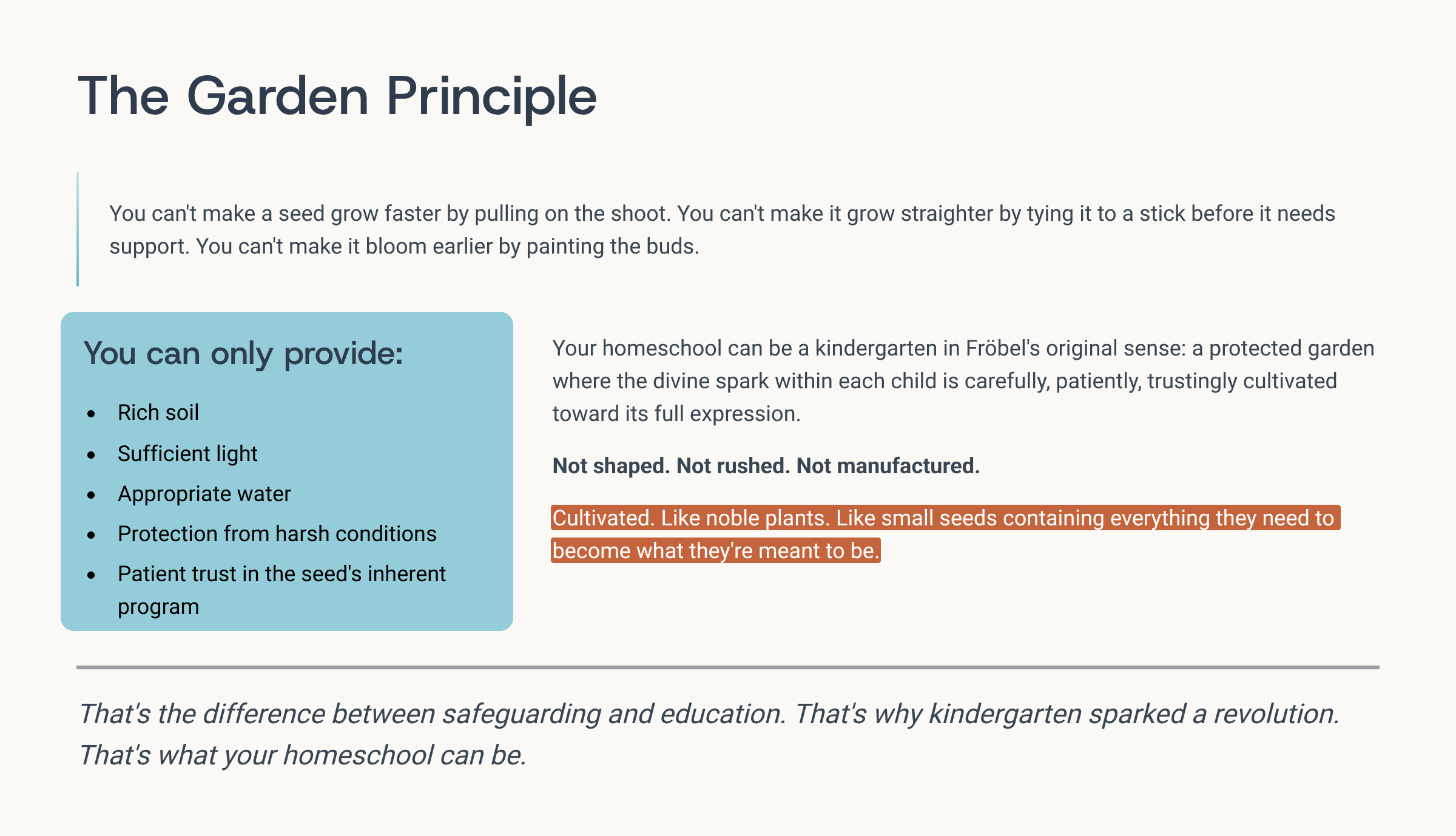 Your homeschool can be a kindergarten in Fröbel’s original sense: not a rigid institution, but a protected garden where the divine spark within each child is carefully, patiently, trustingly cultivated toward its full expression.