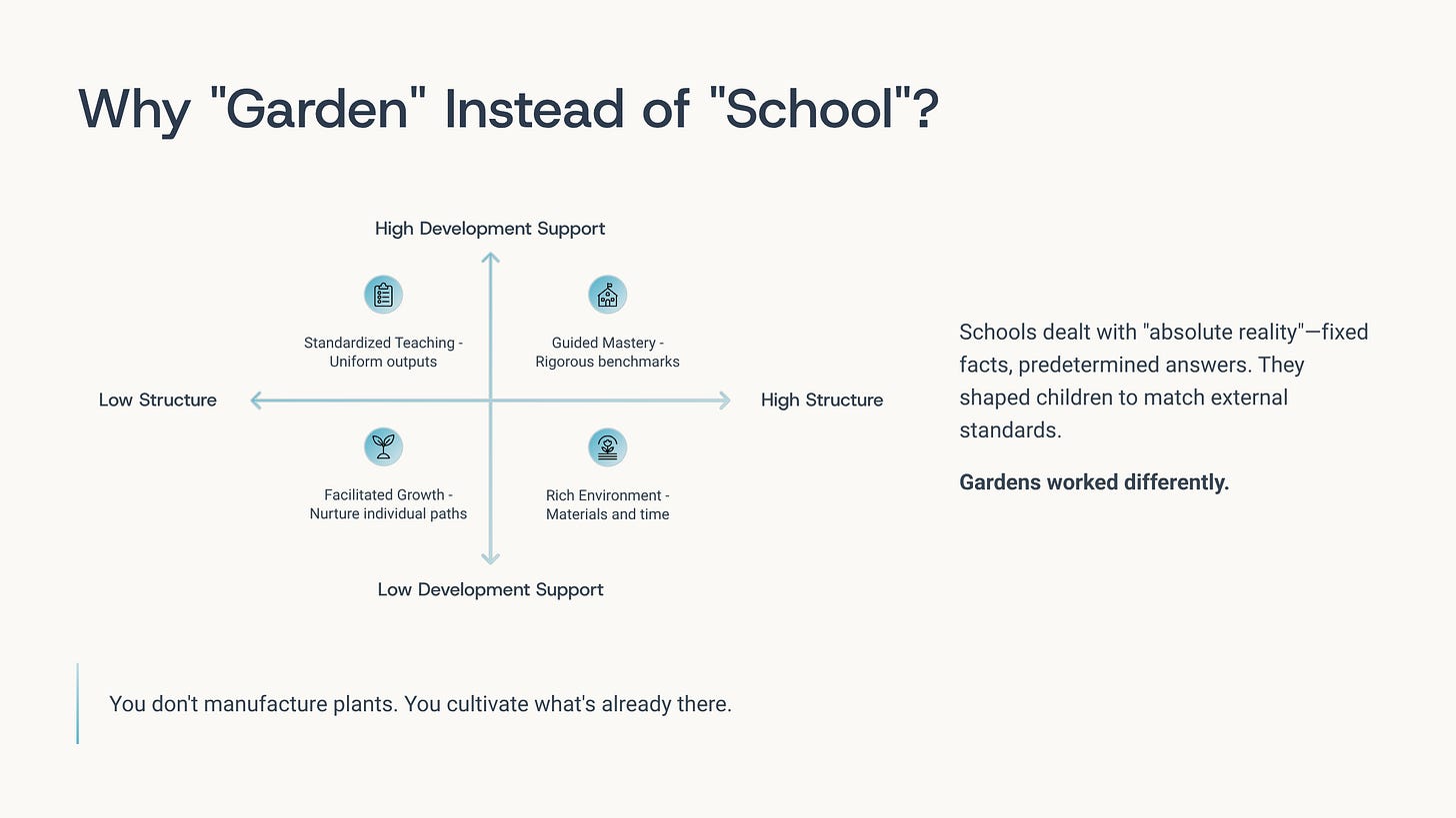 Fröbel didn’t call it kindergarten because it sounded nice. He called it a garden because that’s what it was: a protected space where living things grow according to their nature when given appropriate conditions.