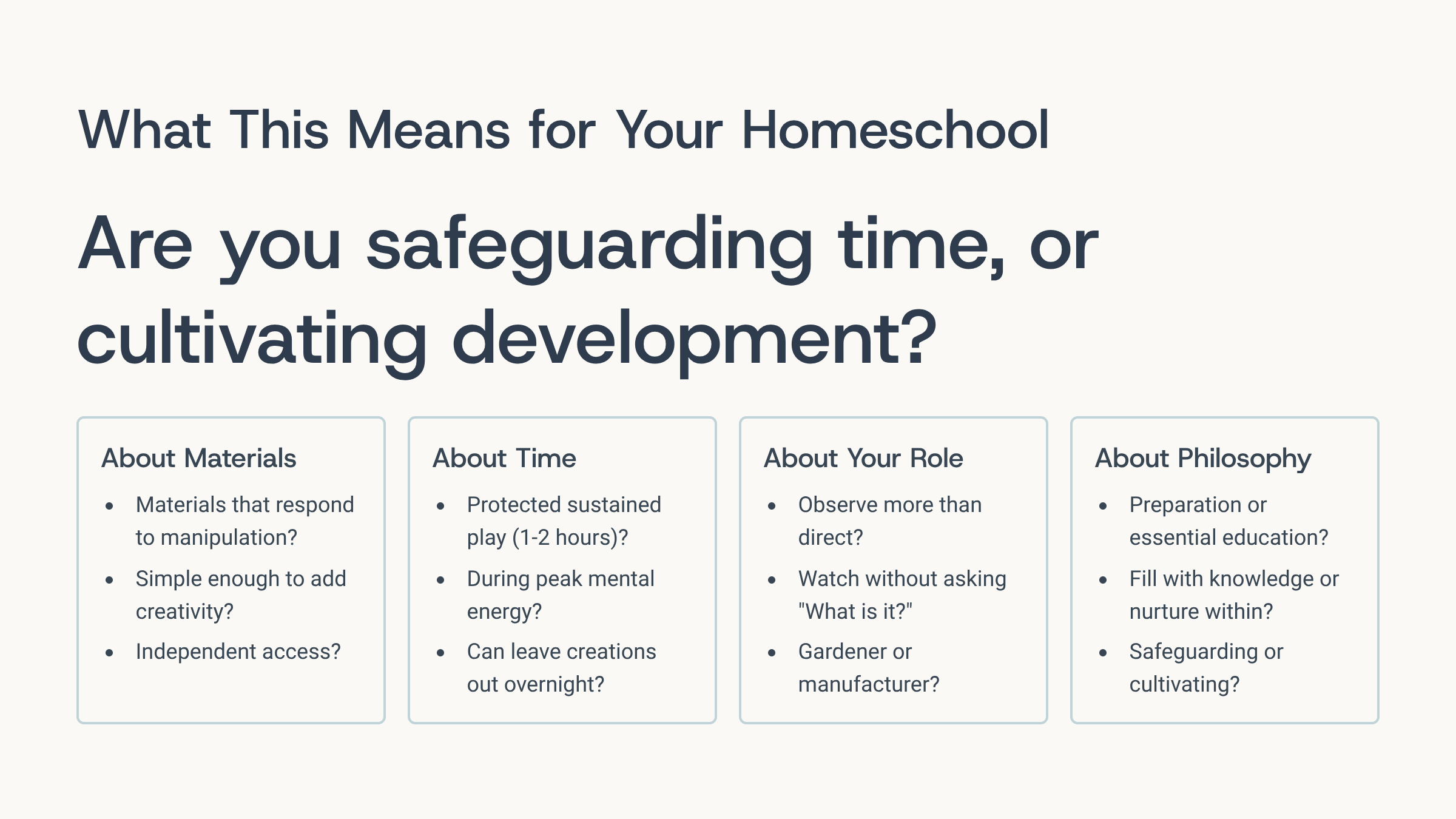 Have you noticed the difference between safeguarding time and cultivating development in your own home? What shifted when you stopped interrupting natural play? Reply and share your observations—I learn as much from you as you learn from these articles.