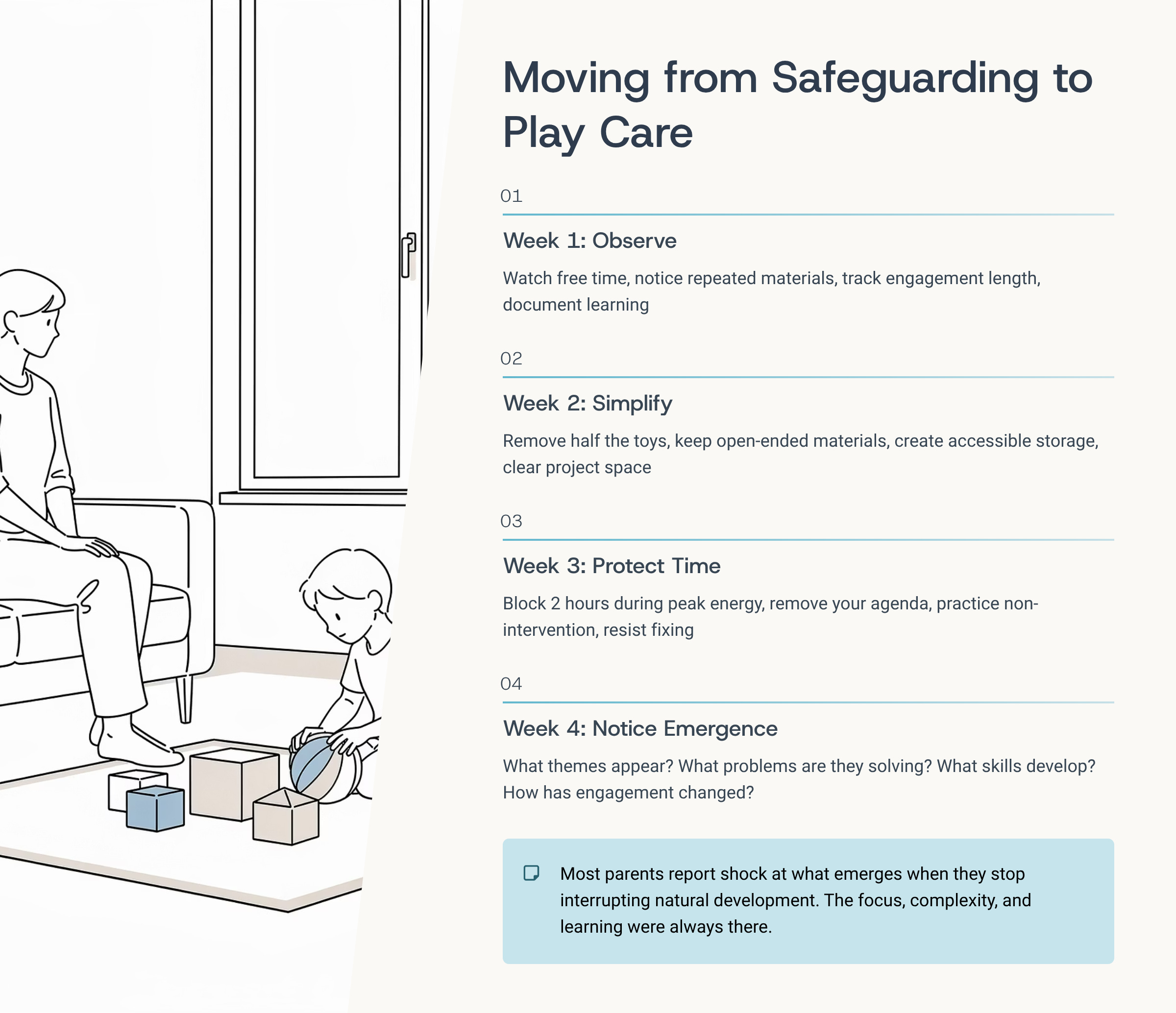 Most parents report being shocked by what emerges when they stop interrupting natural development. The focus, complexity, and learning were always there—we just kept disrupting them with our helpful involvement.