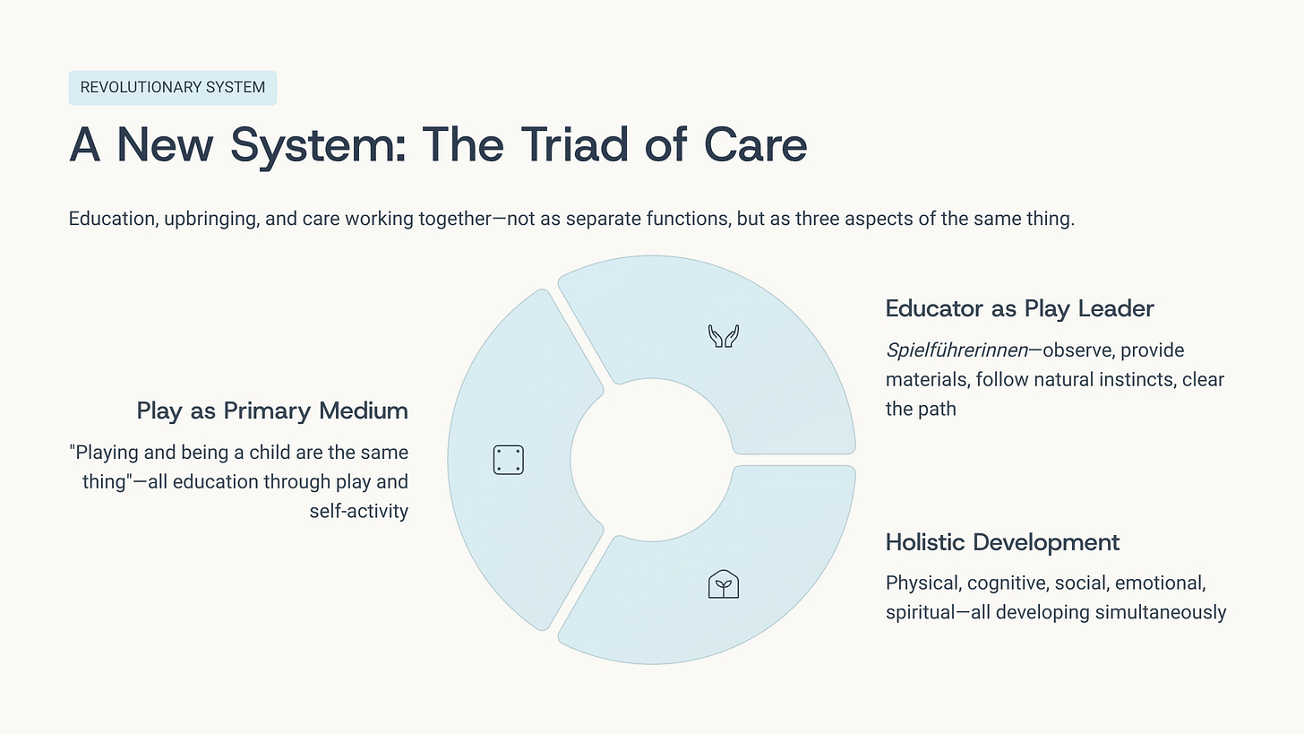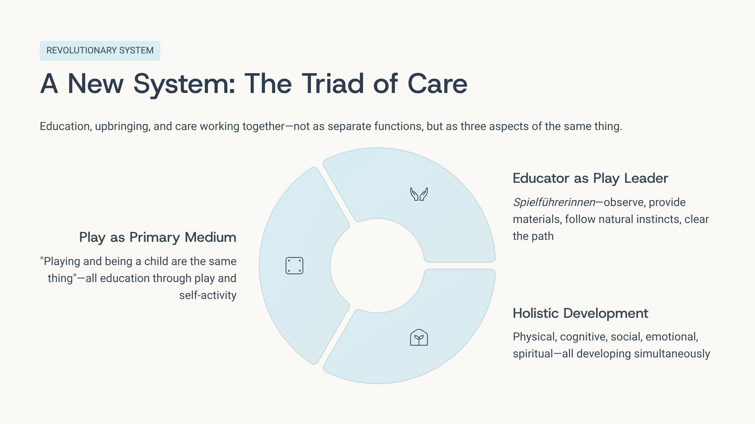 The Fröbelian kindergarten introduced something genuinely revolutionary: a unified system defined by education, upbringing, and care working together—not as separate functions, but as three aspects of the same thing.