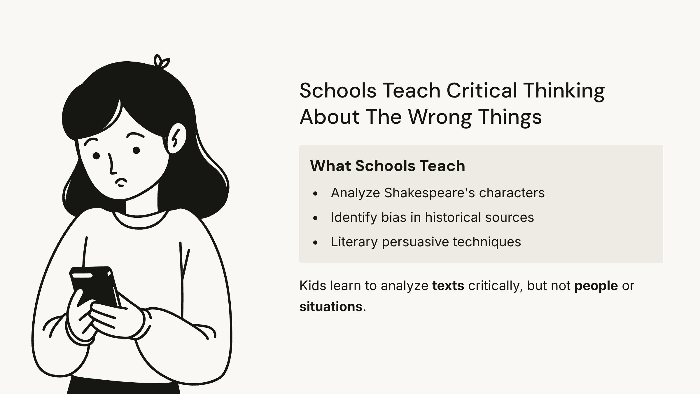 Schools don’t teach kids to spot these patterns. They teach critical thinking about books and historical events, not about the manipulation happening in the hallway and on their phones.