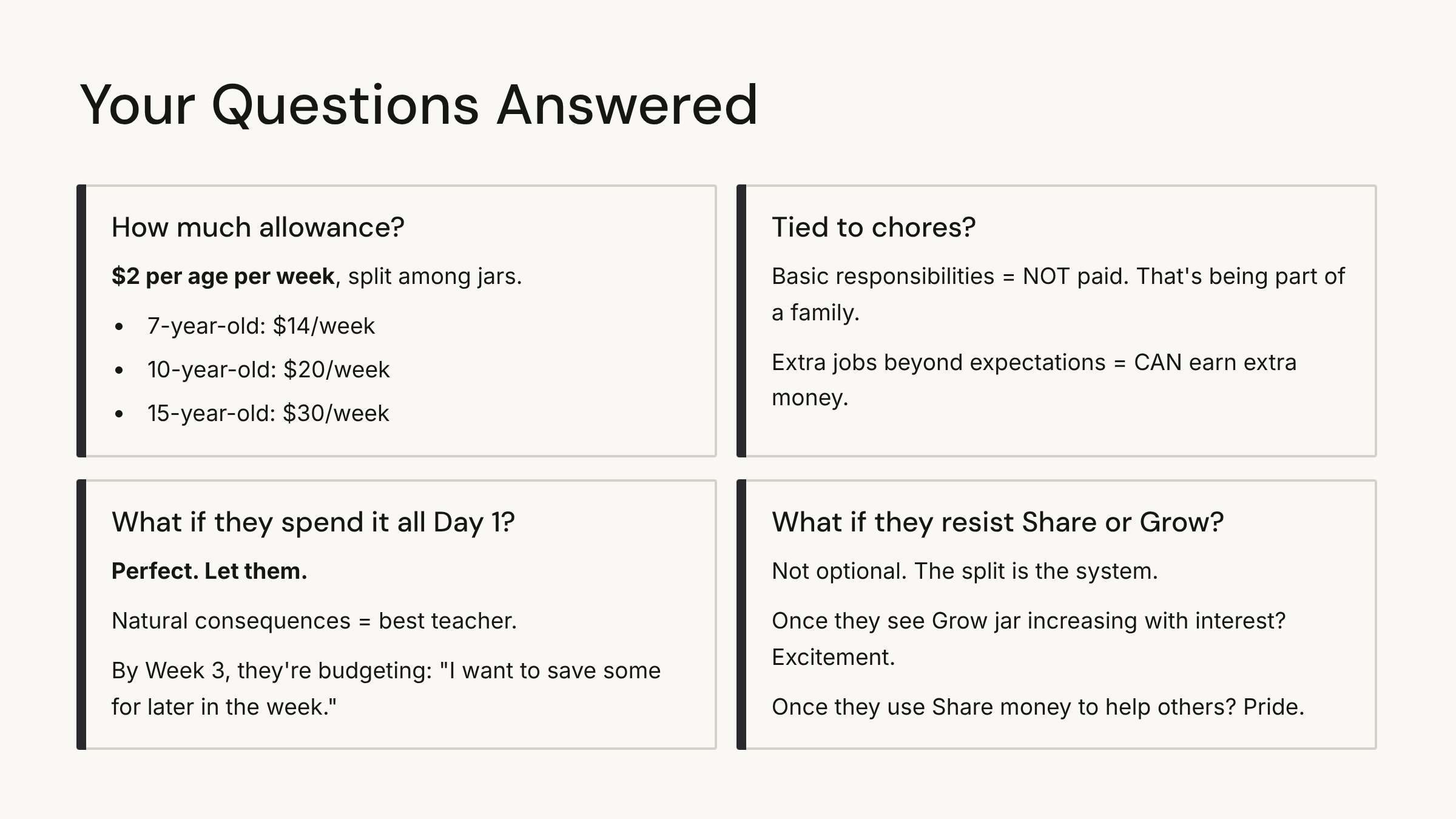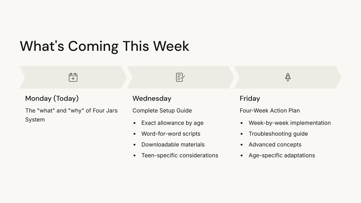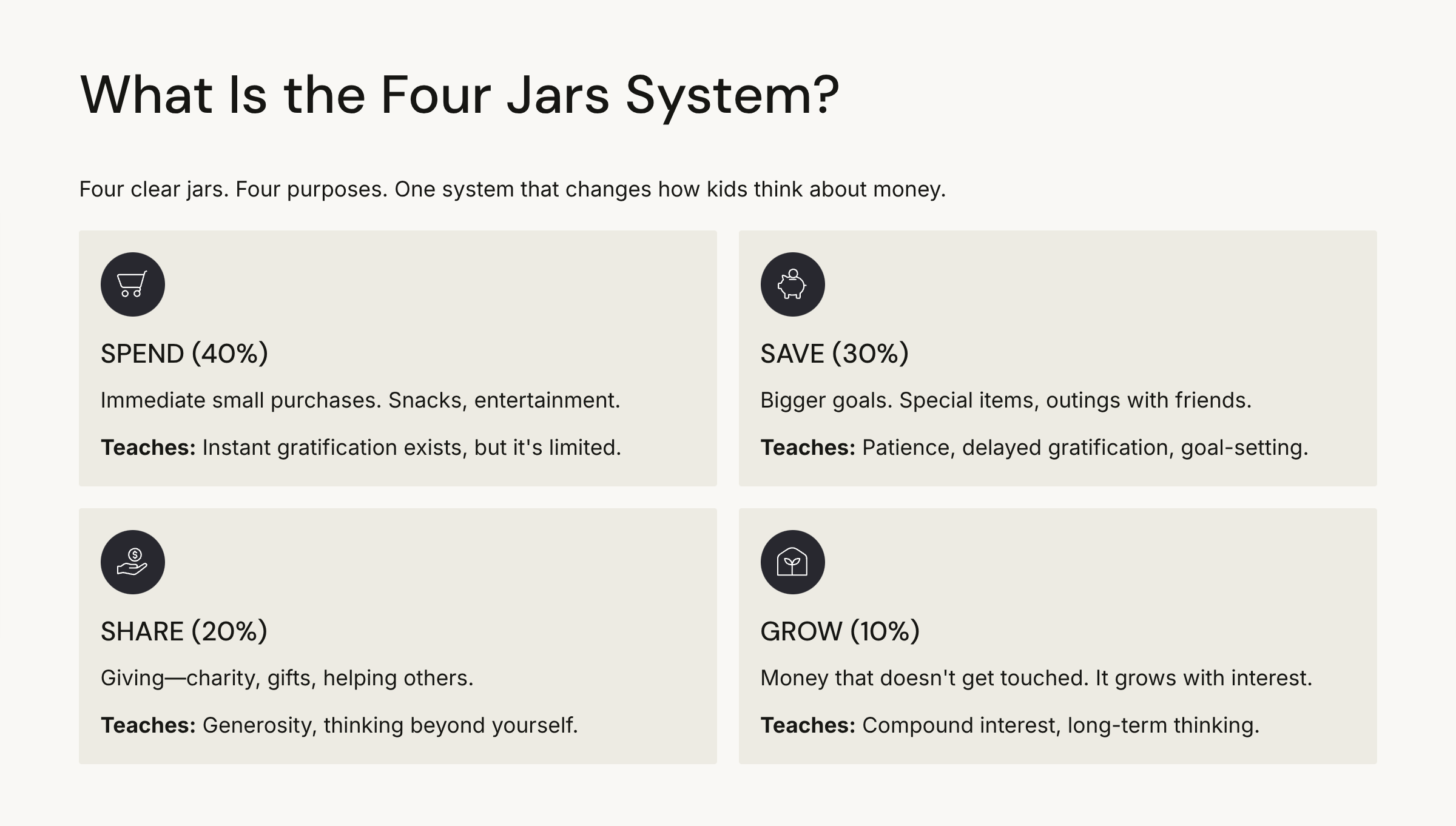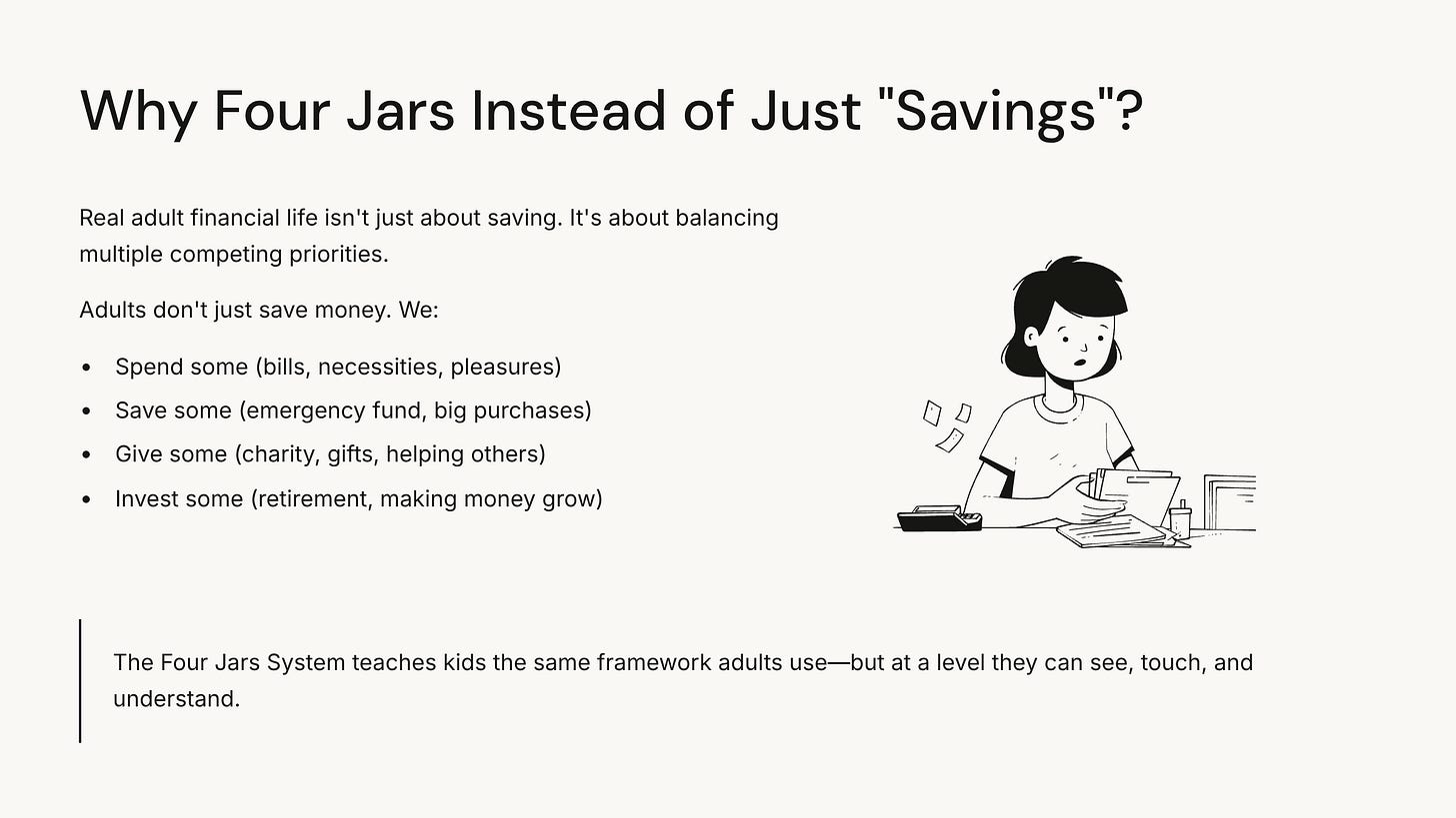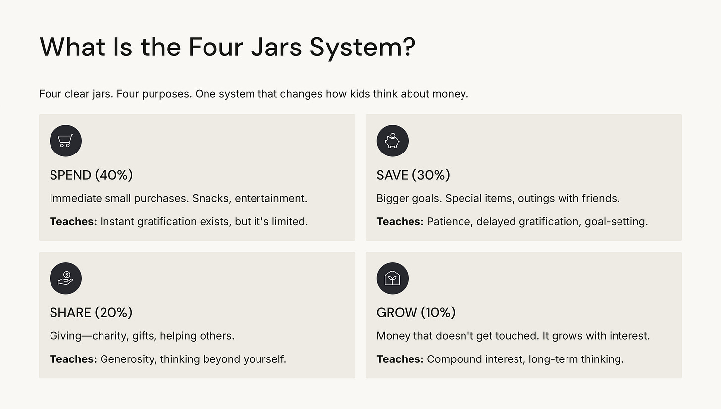 That’s it. Four jars. Four concepts. One system that changes how kids think about money.