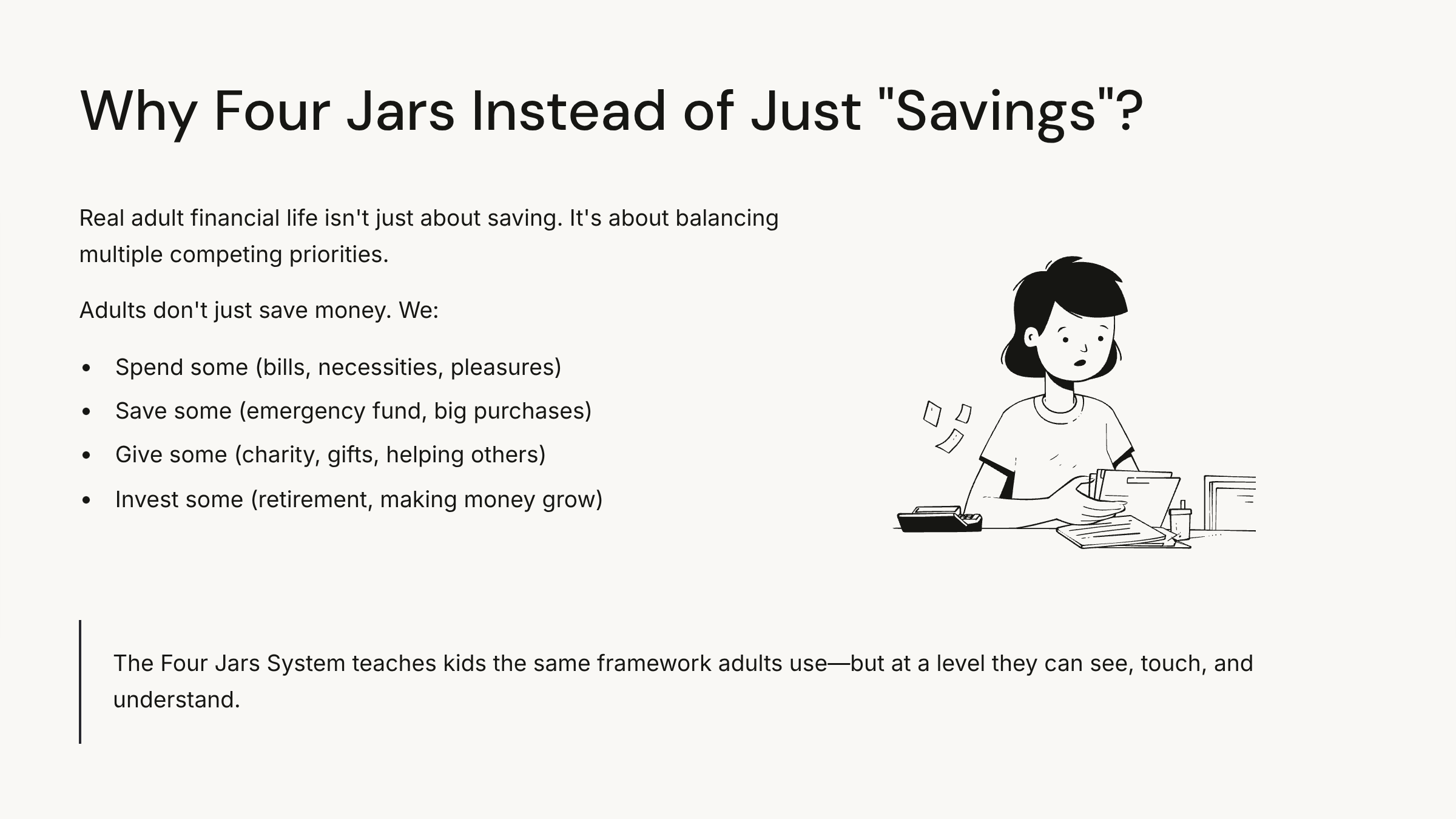 The Four Jars System teaches kids the same framework adults use—but at a level they can see, touch, and understand.