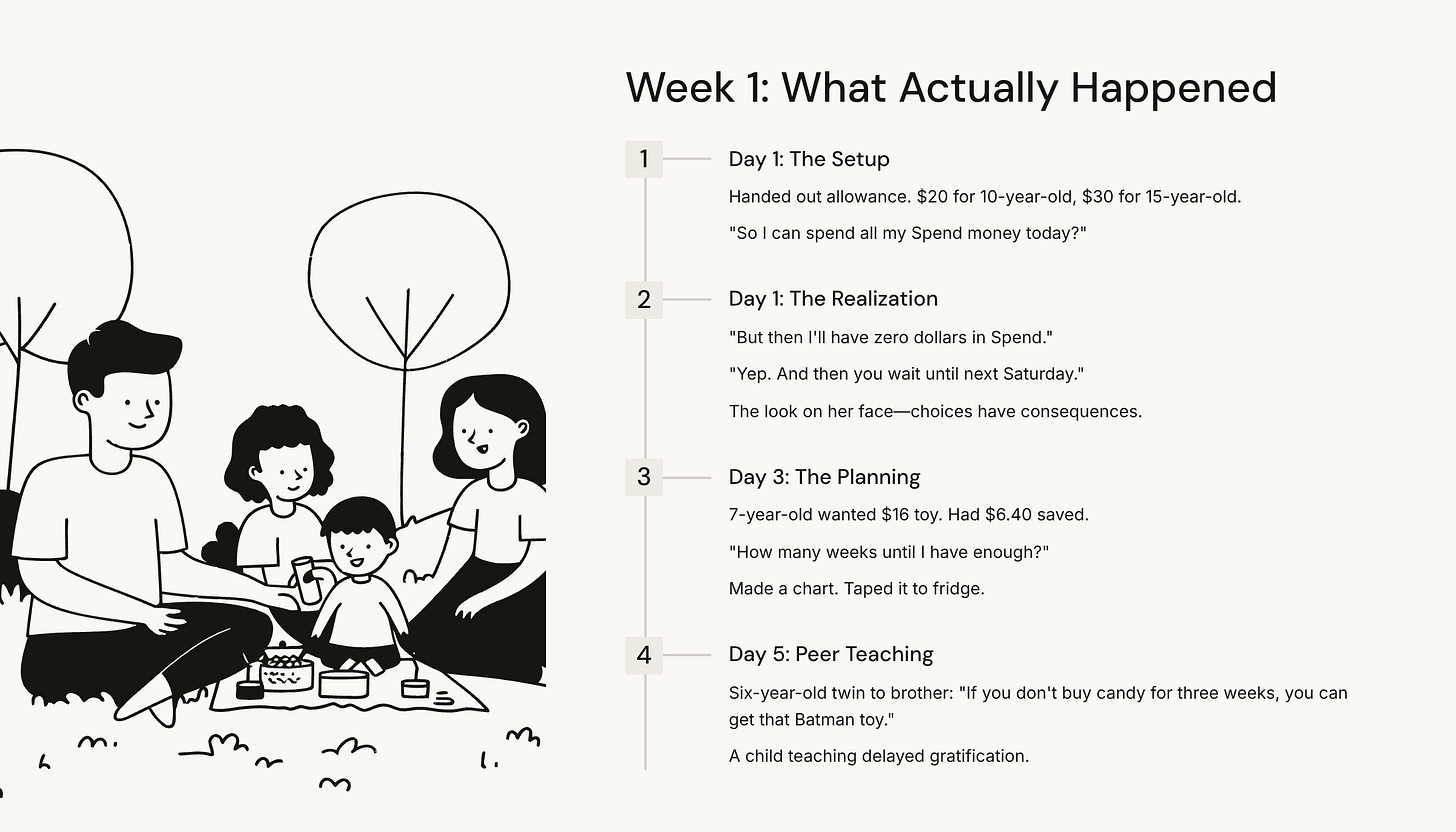 She set up the jars on Saturday morning with her two kids (6 and 8). Explained the system. Handed out the weekly allowance: $12 for the 6-year-old, $16 for the 8-year-old.