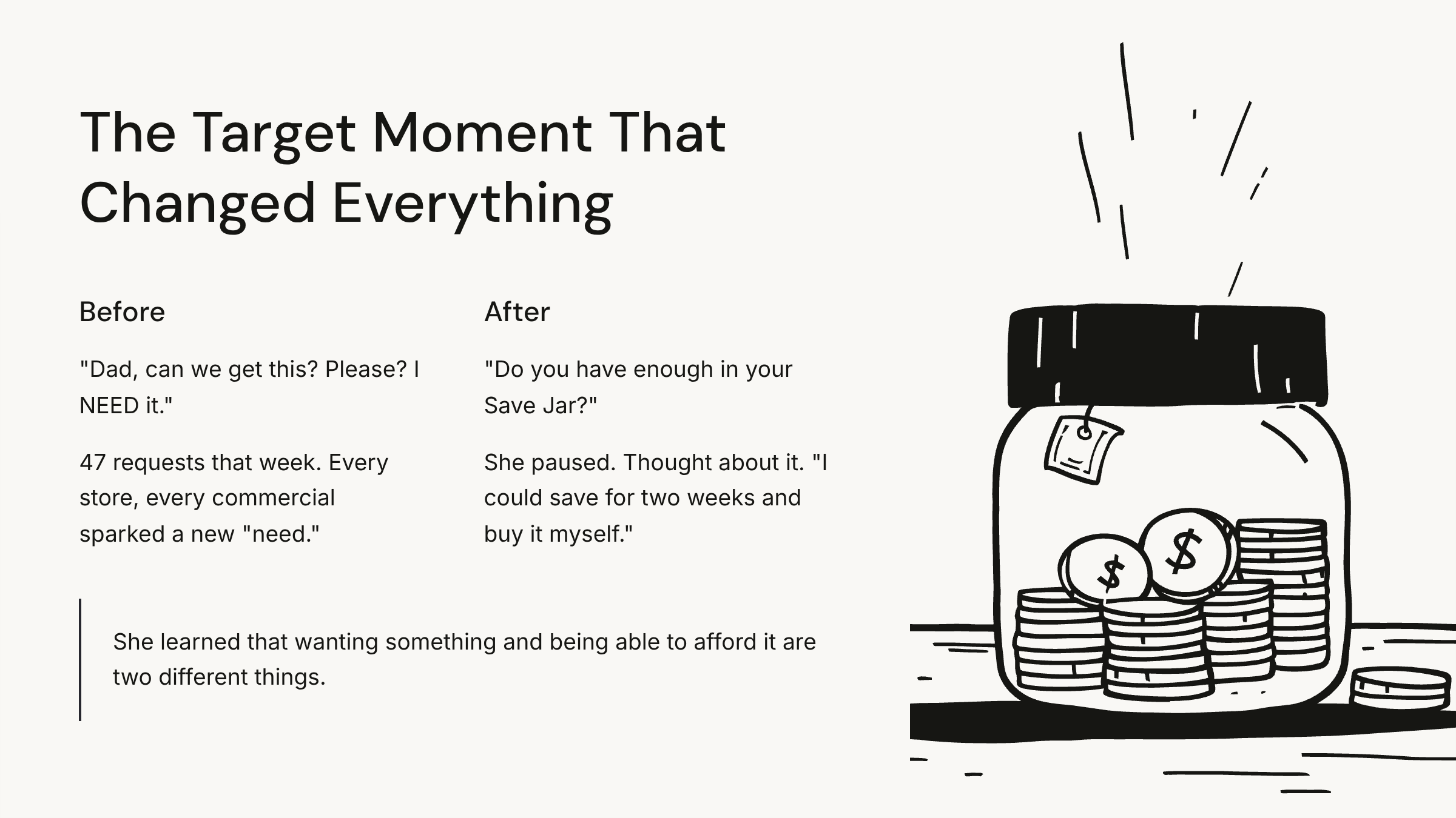 And Sarah’s kids? They stopped begging. Actually stopped. Because they knew the answer: “Do you have money in your jar? No? Then you’re saving for it or you’re waiting.”