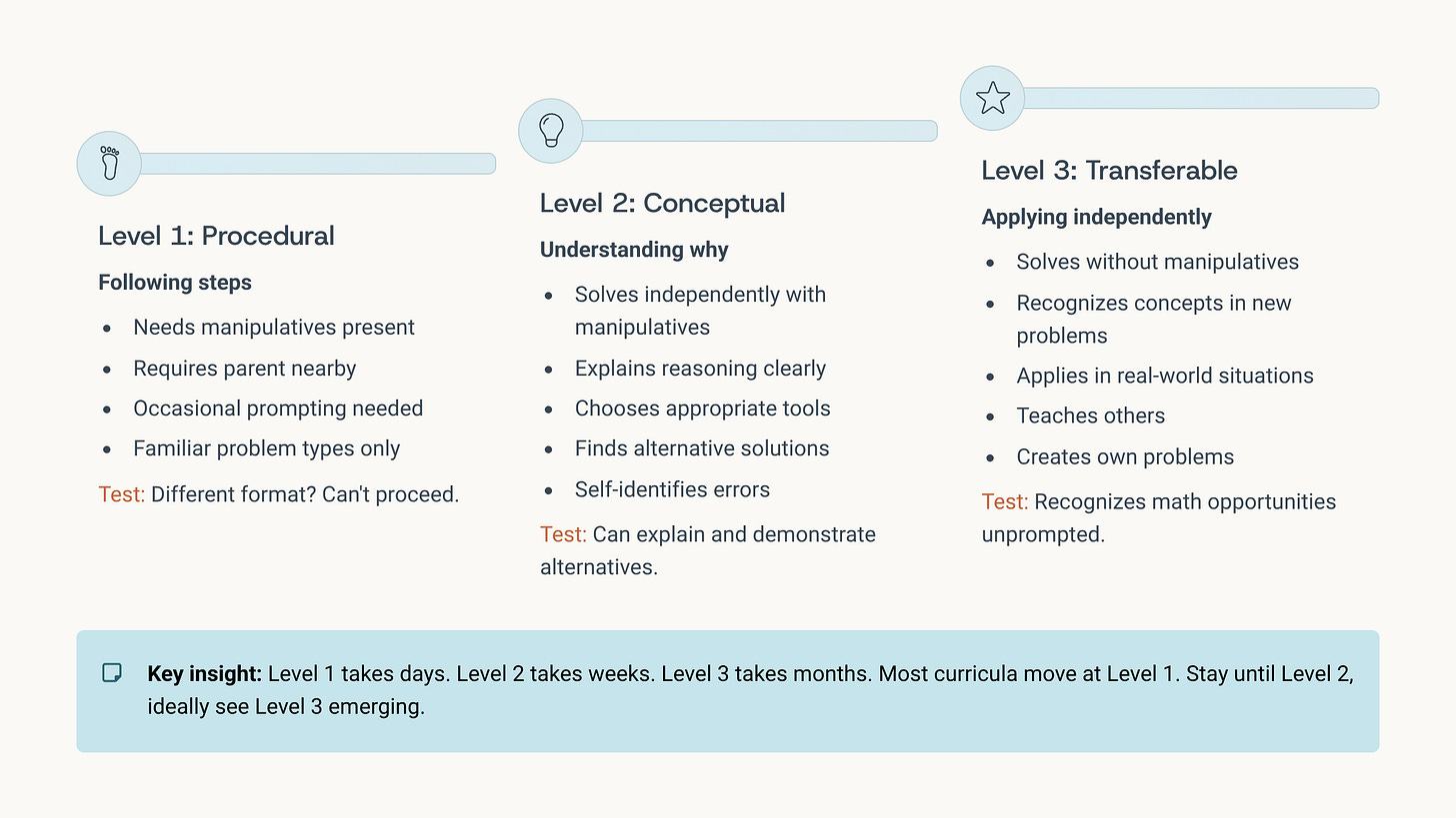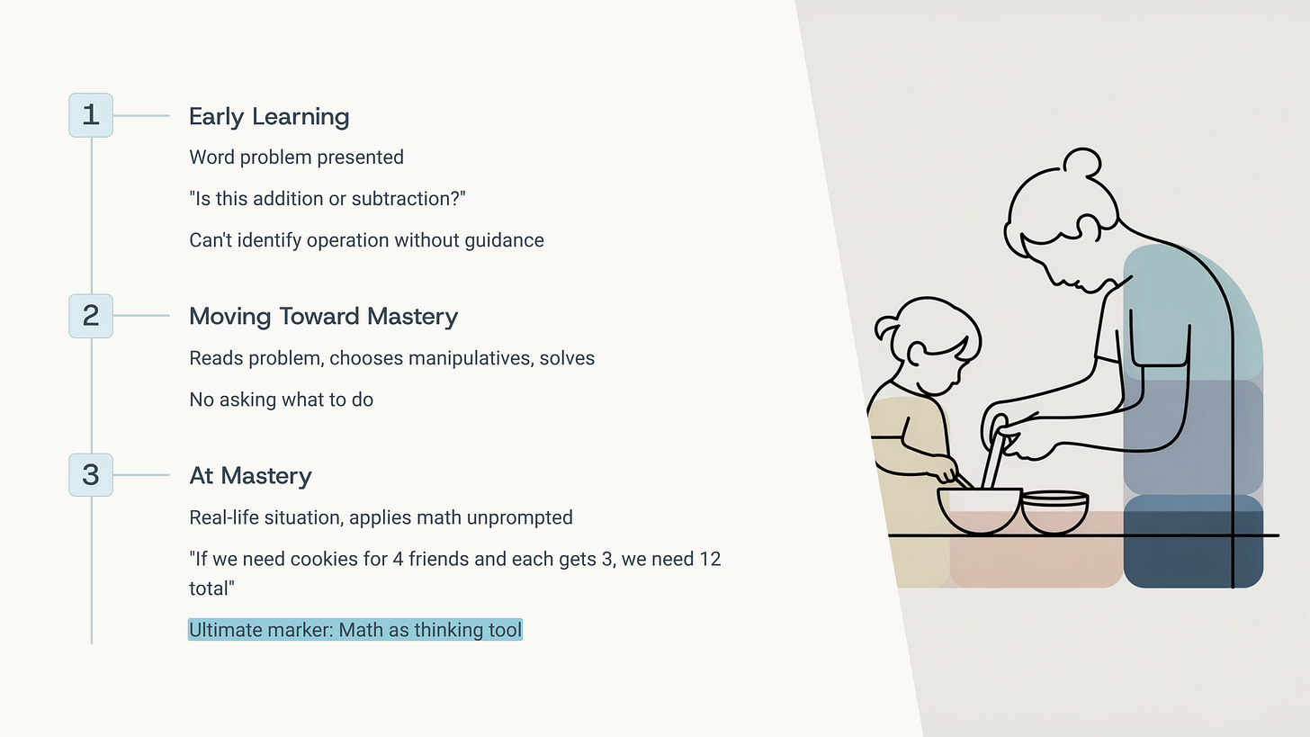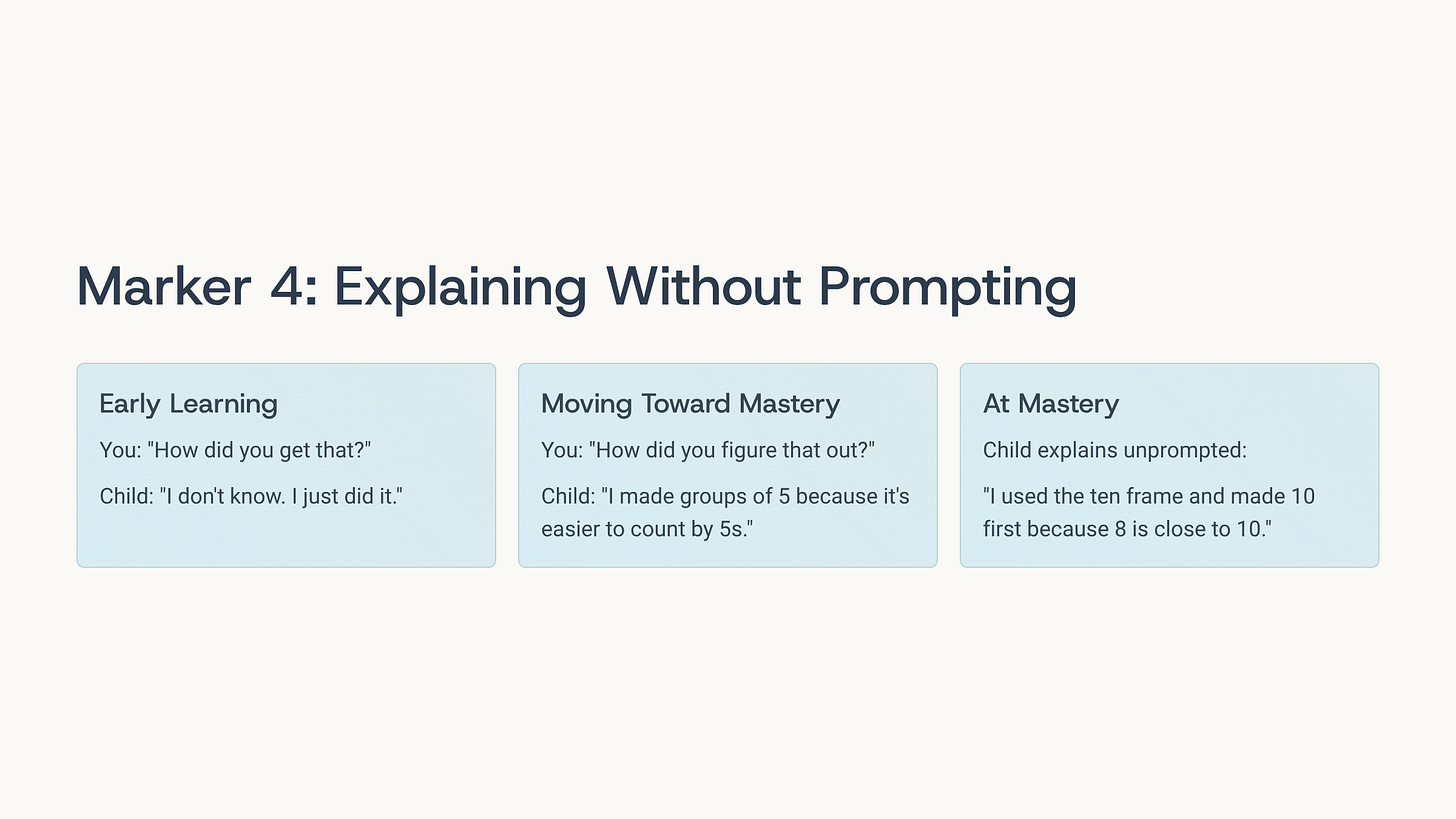 At mastery: Your child catches errors while working, not just at the end. They’ve internalized what “correct” looks and feels like.