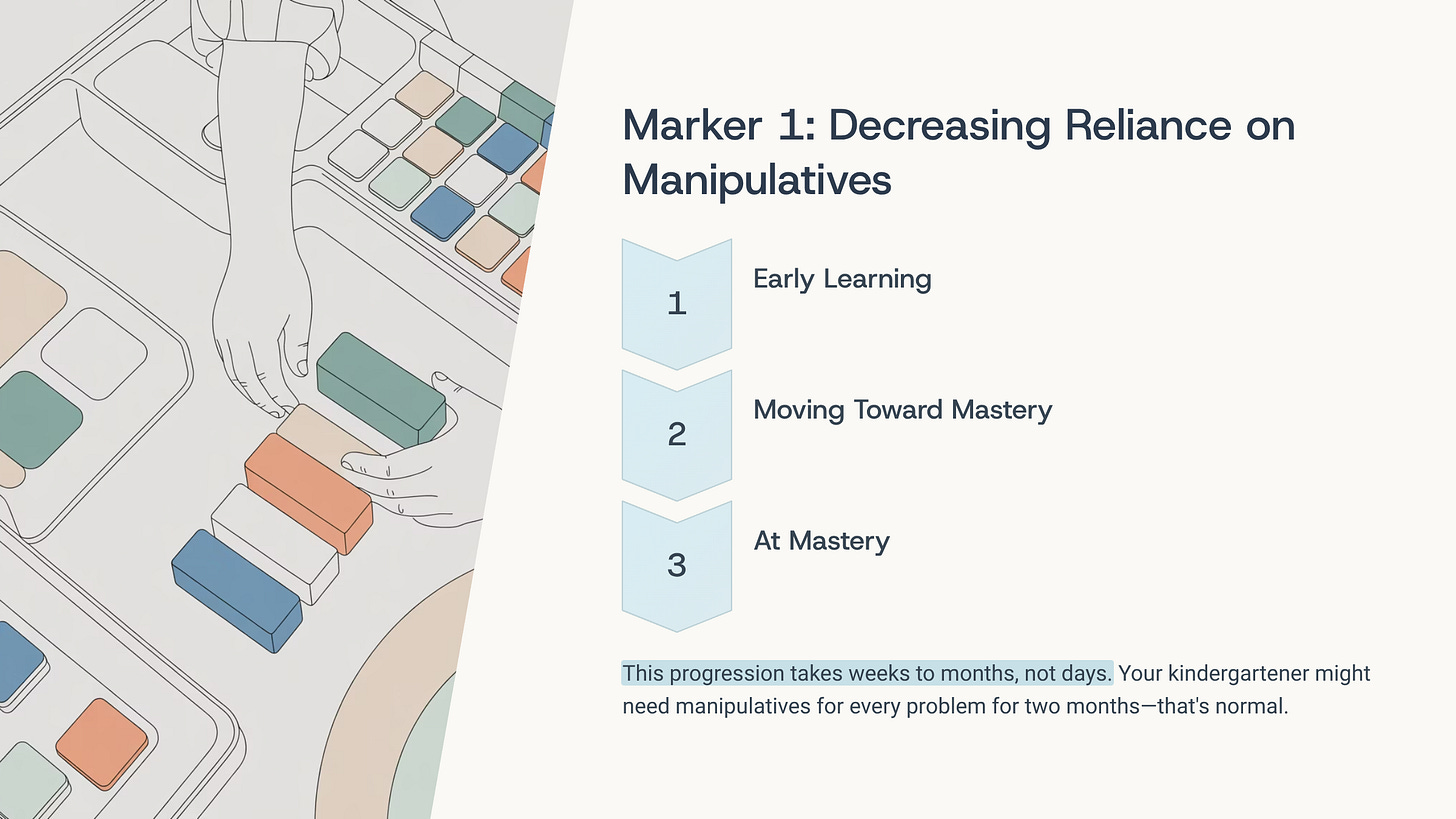 Early in learning (Level 1): Your child reaches for manipulatives immediately. Counts every block, one by one. Needs to physically act out every problem.