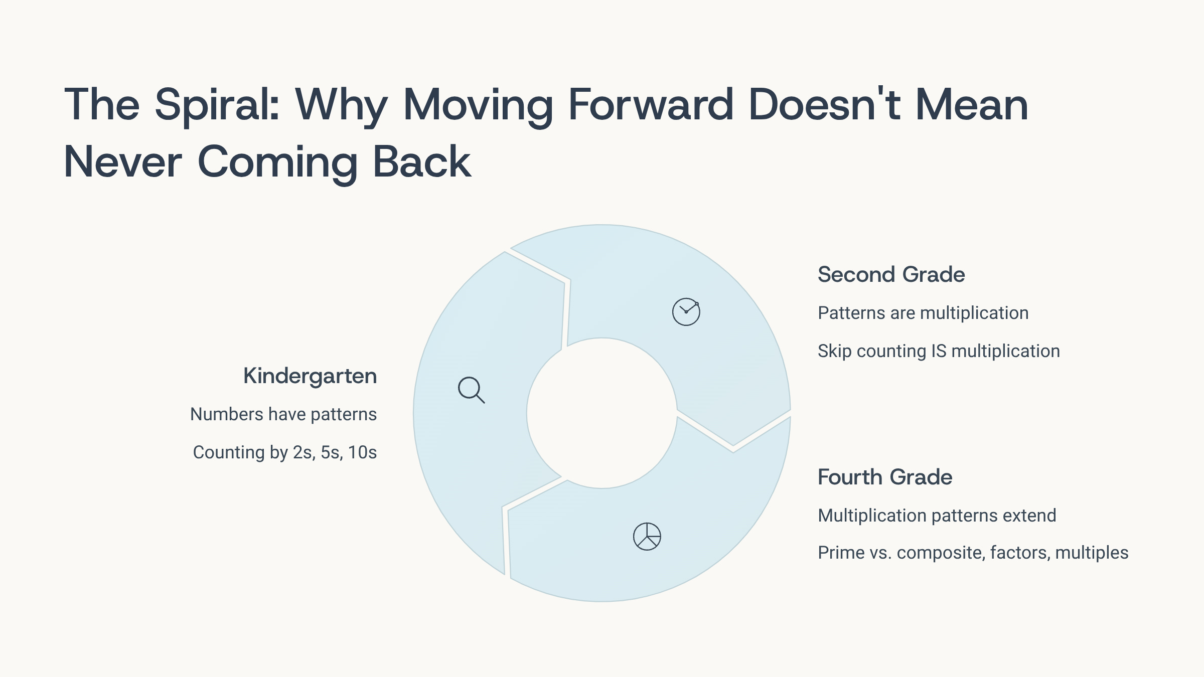 Mathematical learning spirals. You encounter concepts multiple times with increasing sophistication.