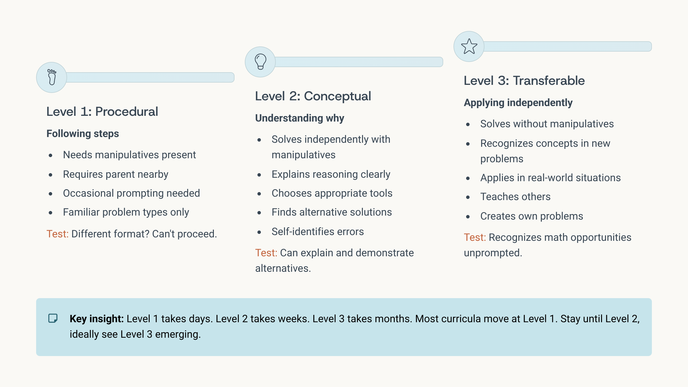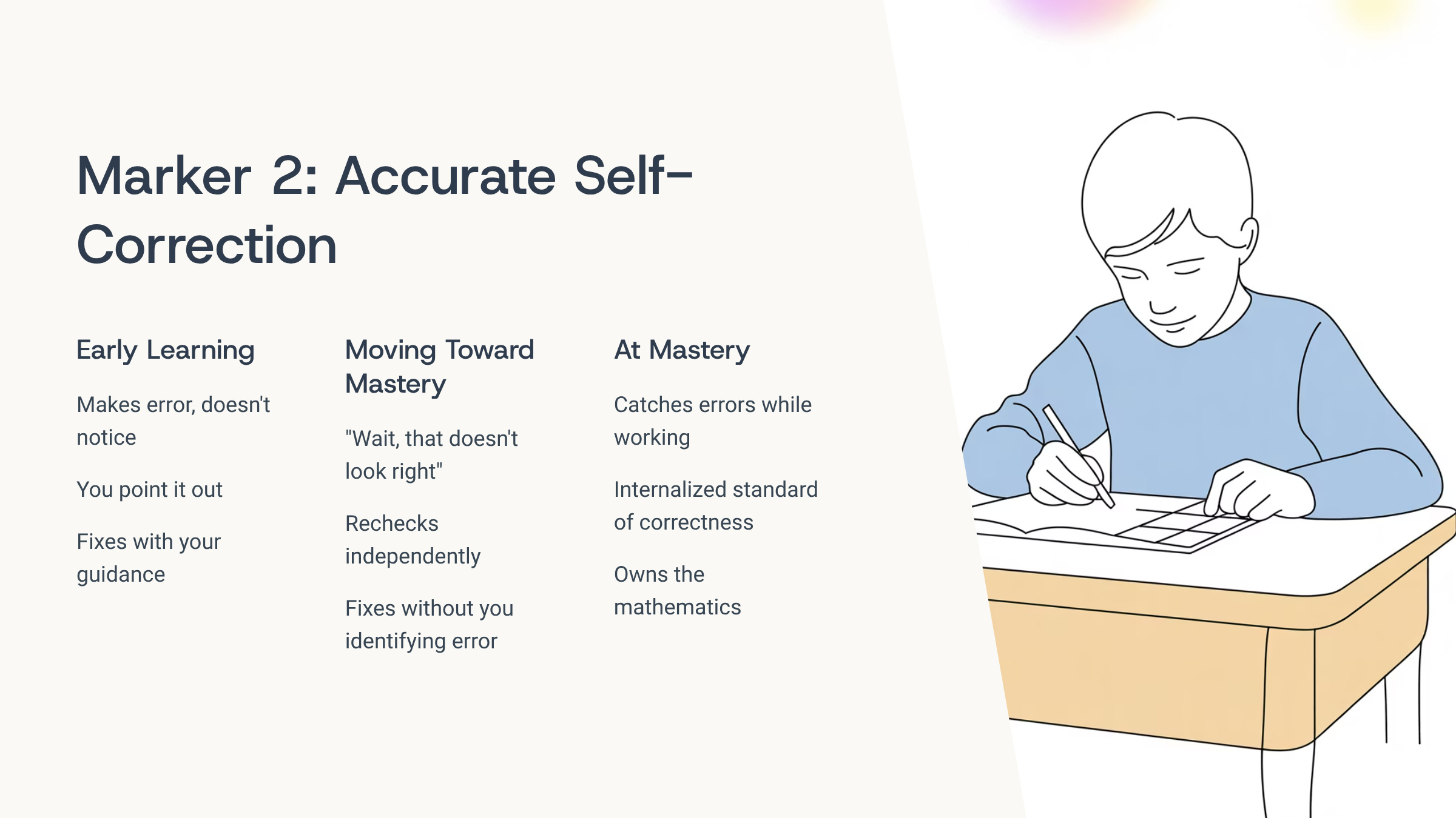 At mastery: Your child catches errors while working, not just at the end. They’ve internalized what “correct” looks and feels like.