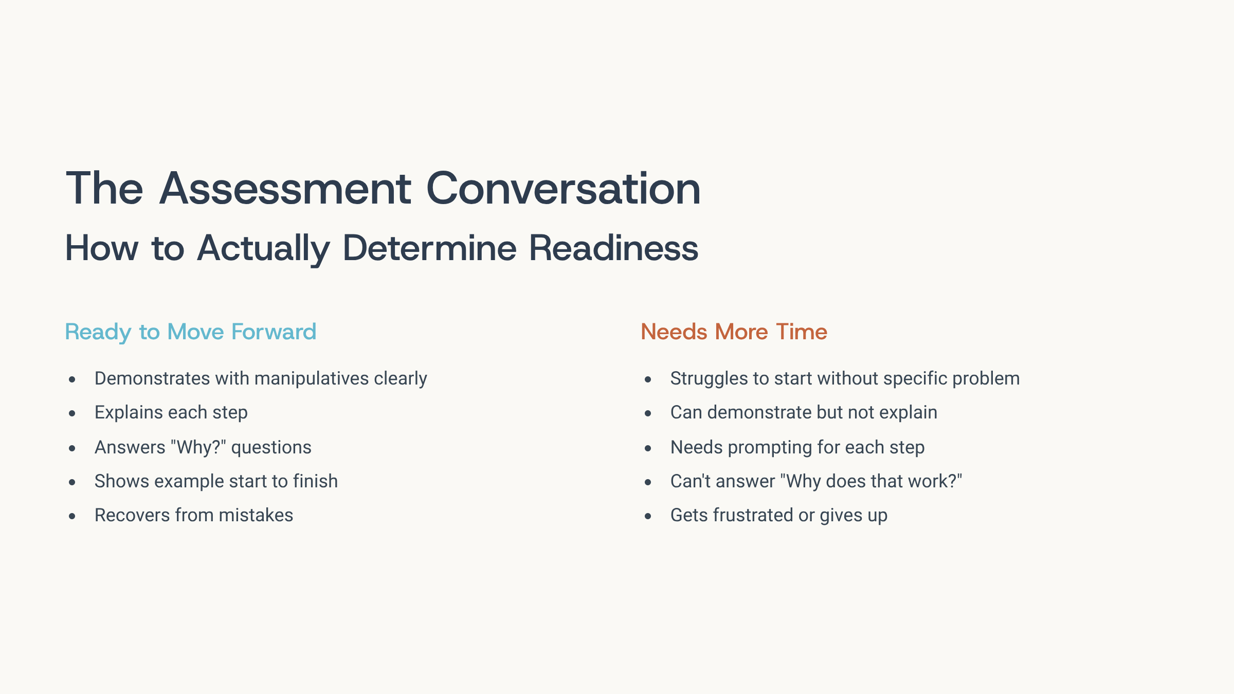 But something feels off. Your child solved the problems, used the manipulatives correctly, and seemed engaged. Yet you’re not confident they’re ready.