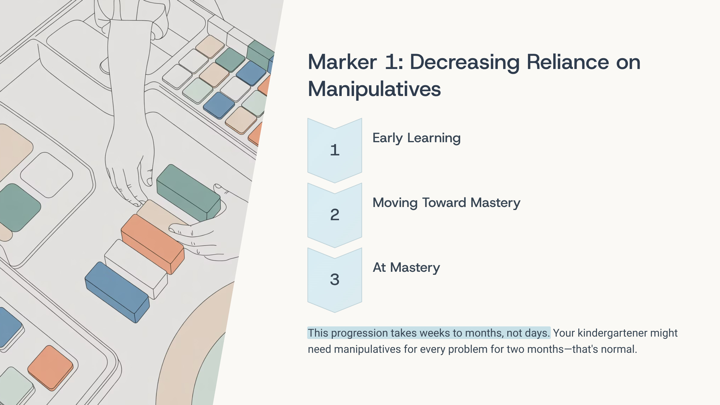 Early in learning (Level 1): Your child reaches for manipulatives immediately. Counts every block, one by one. Needs to physically act out every problem.