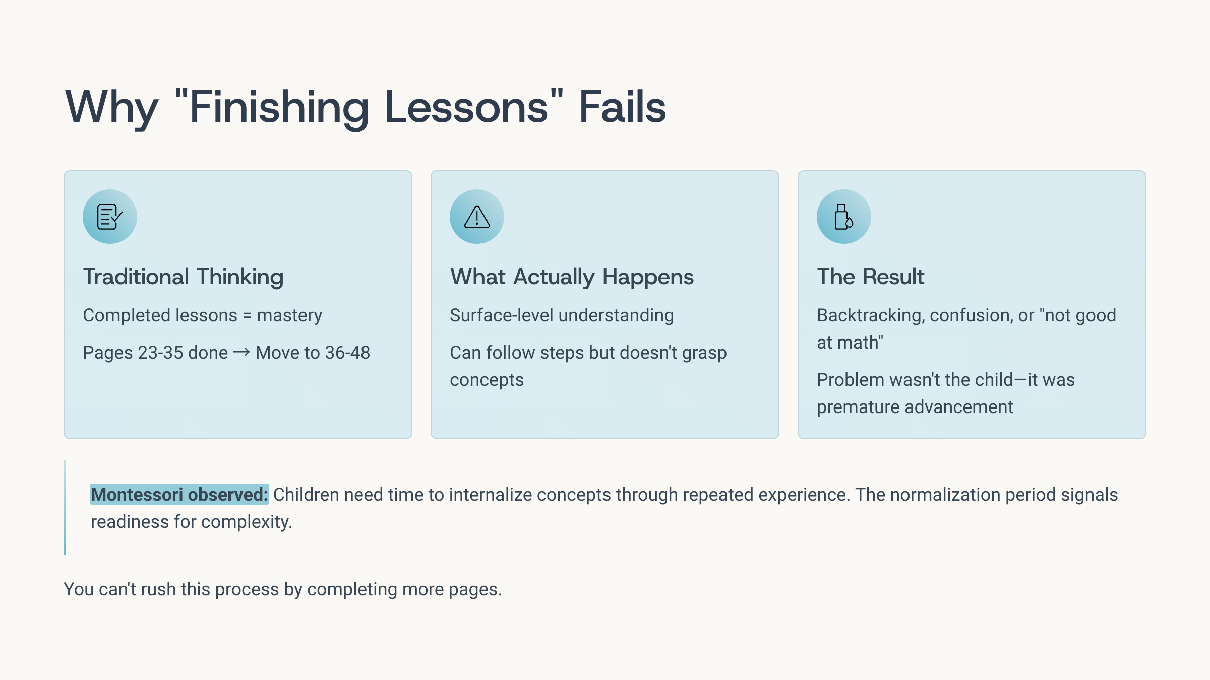 Montessori observed this pattern repeatedly: Children need time to internalize concepts through repeated experience, not just one-time exposure. The normalization period—when a child can work independently and confidently with a concept—is what signals readiness for complexity.
